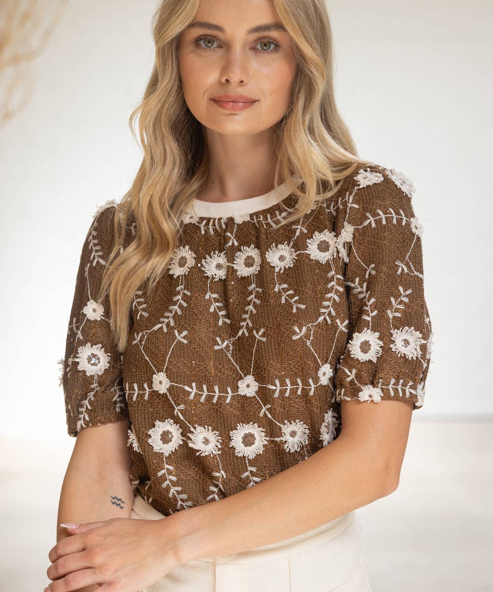 Floral Embroidered Contrast Neck Tie Detailed Top