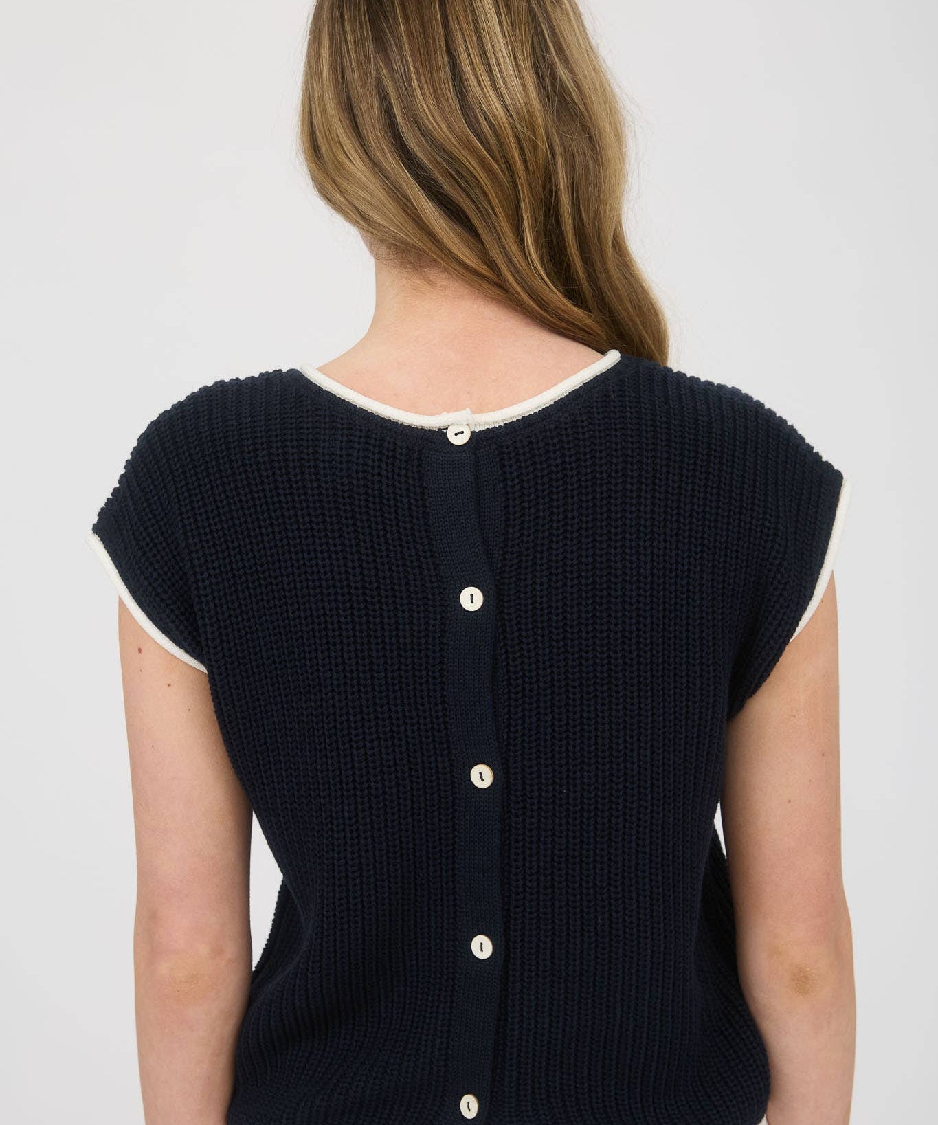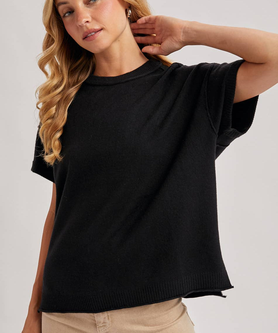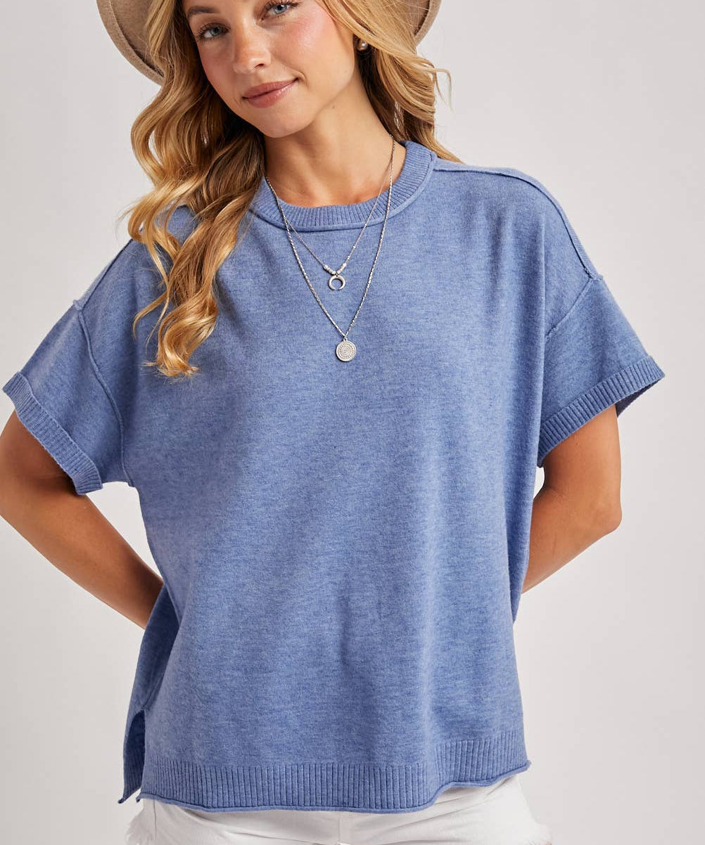 Short Sleeve Knit Navy Sweater Top with Contrast Trim