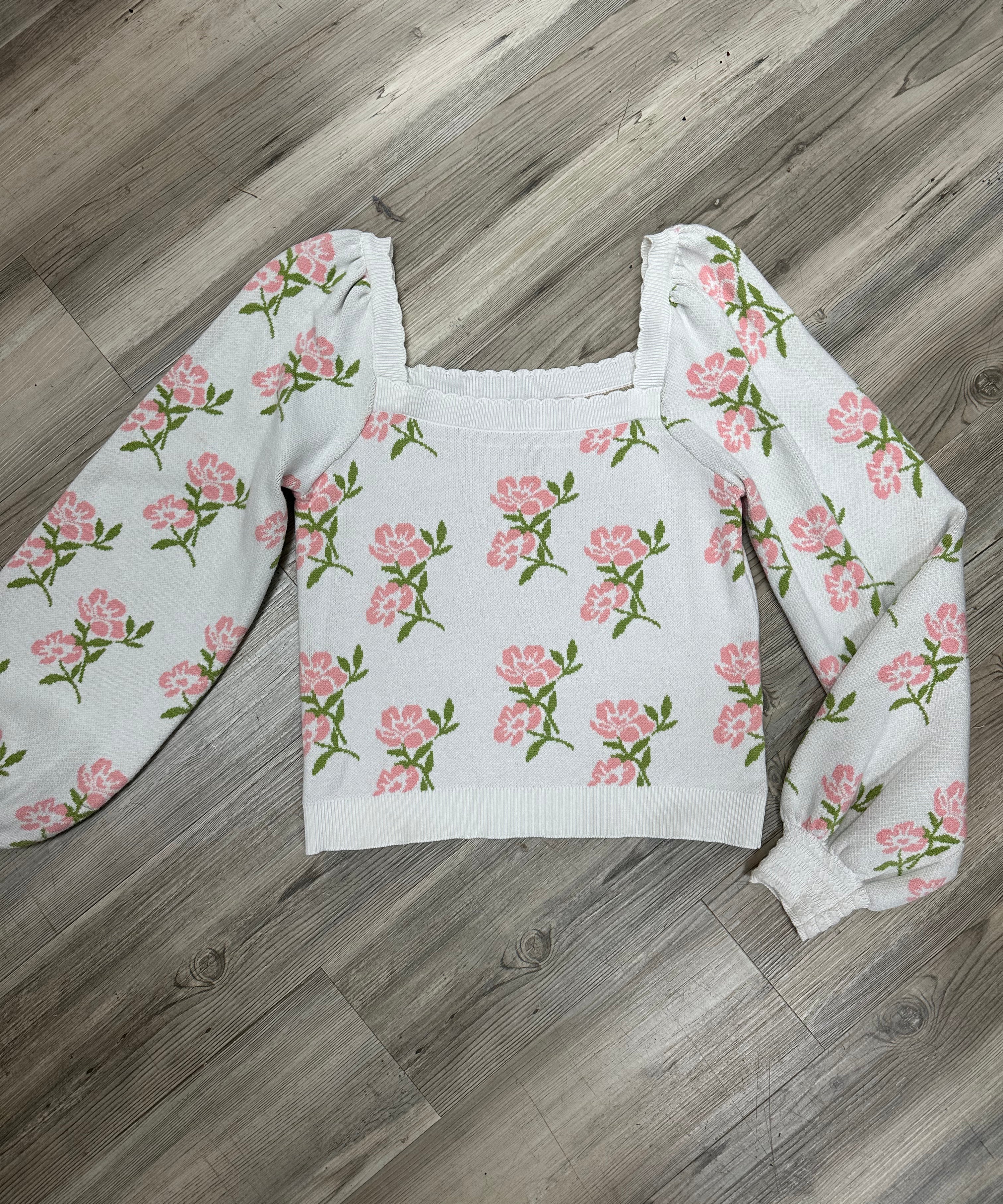 Striped Detail Half Puff Sleeve Ribbed Knit Top