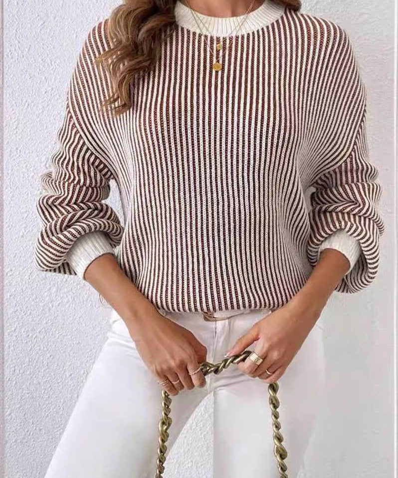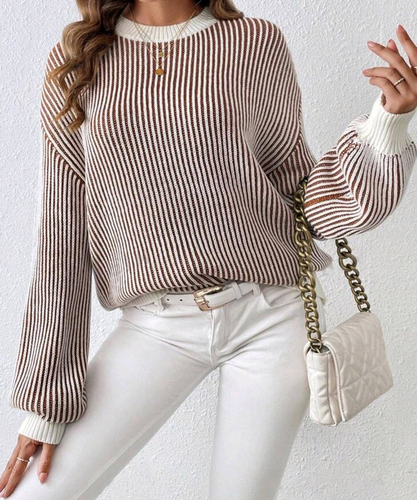 Balloon Sleeves Striped Ribbed Knit Sweater Jumper