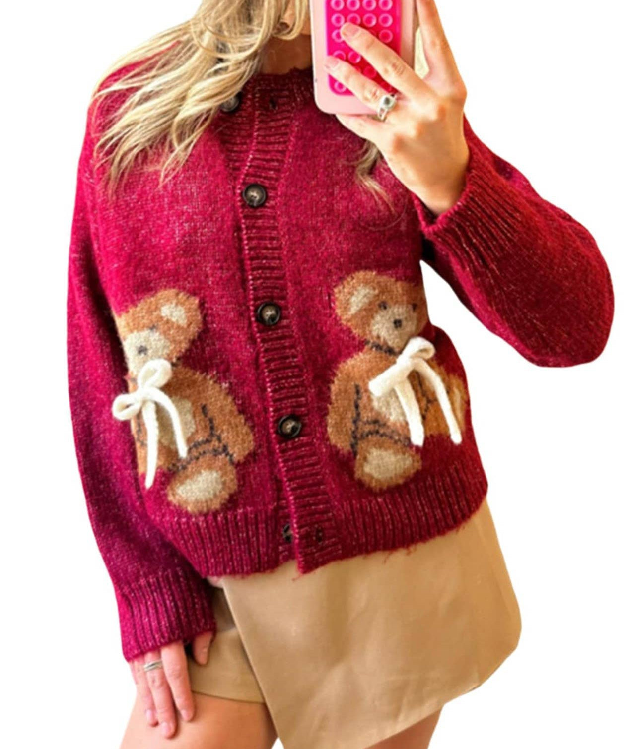 Teddy Bear Patterned Buttoned Knit Sweater Cardigan