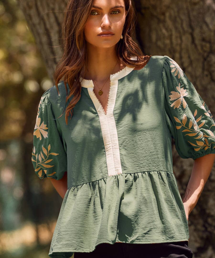 Womens Floral Embroidered Mix Media Peplum Top