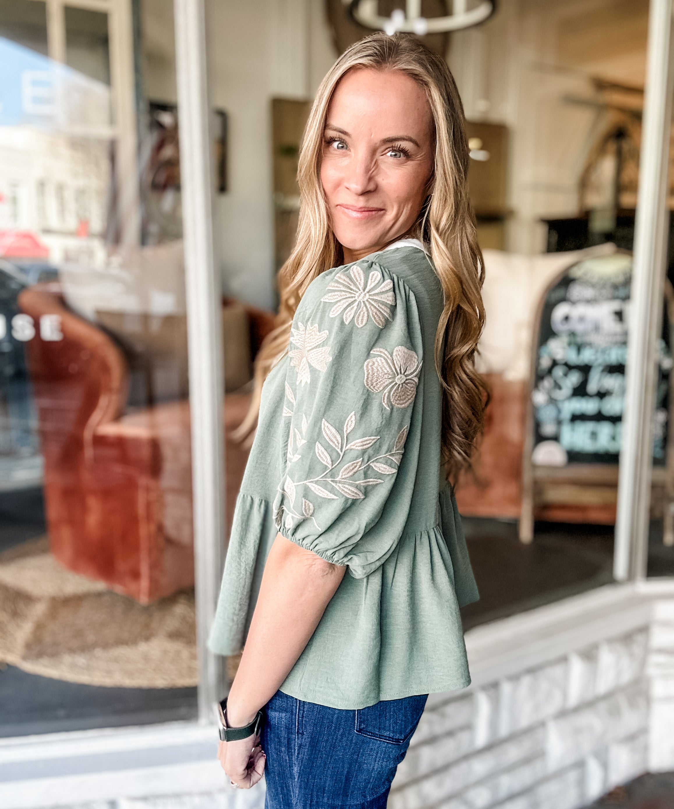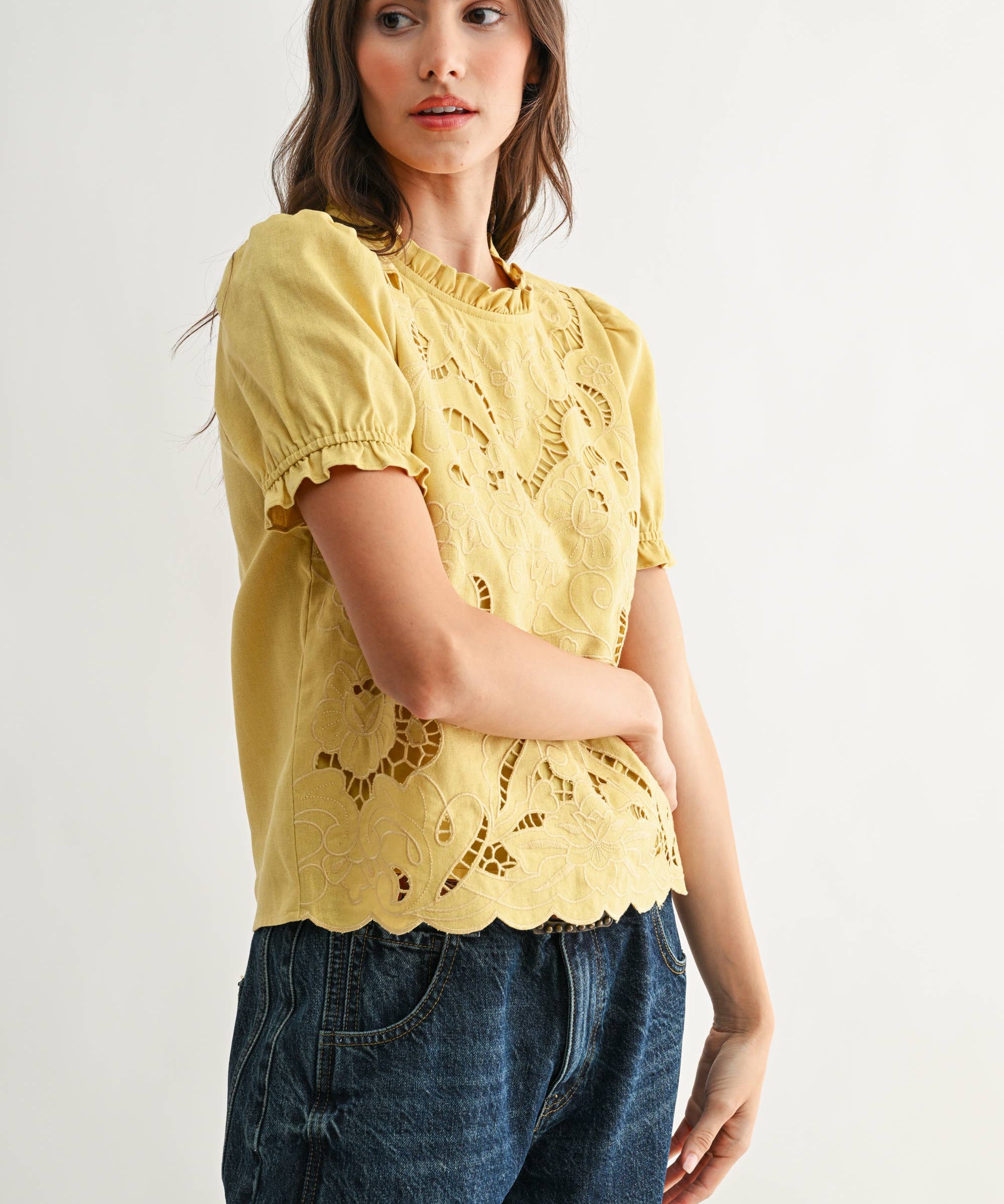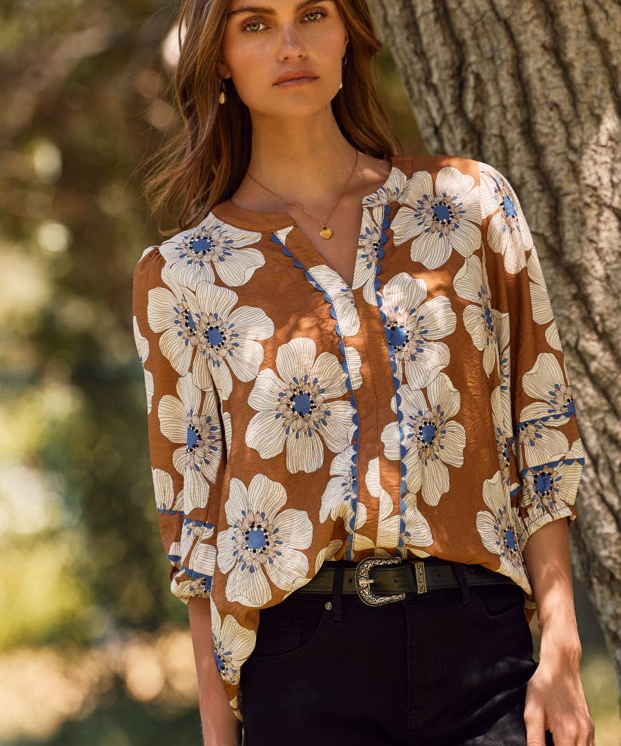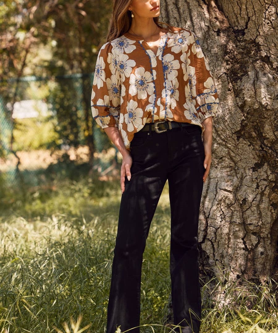 Floral Embroidered Contrast Neck Tie Detailed Top