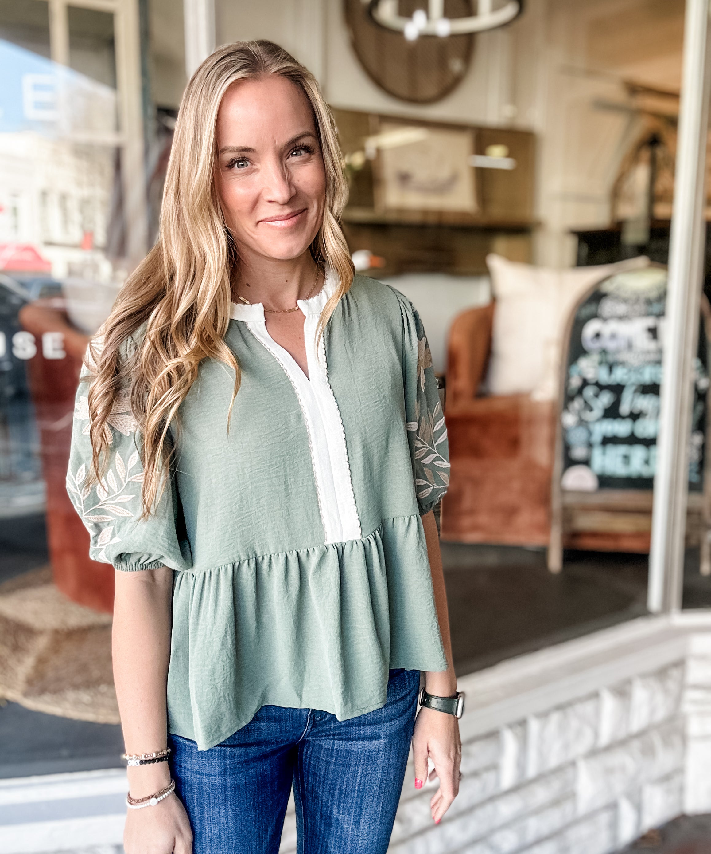 Penelope Floral Organza Puff Sleeve Waffle Knit Blouse
