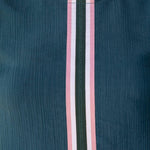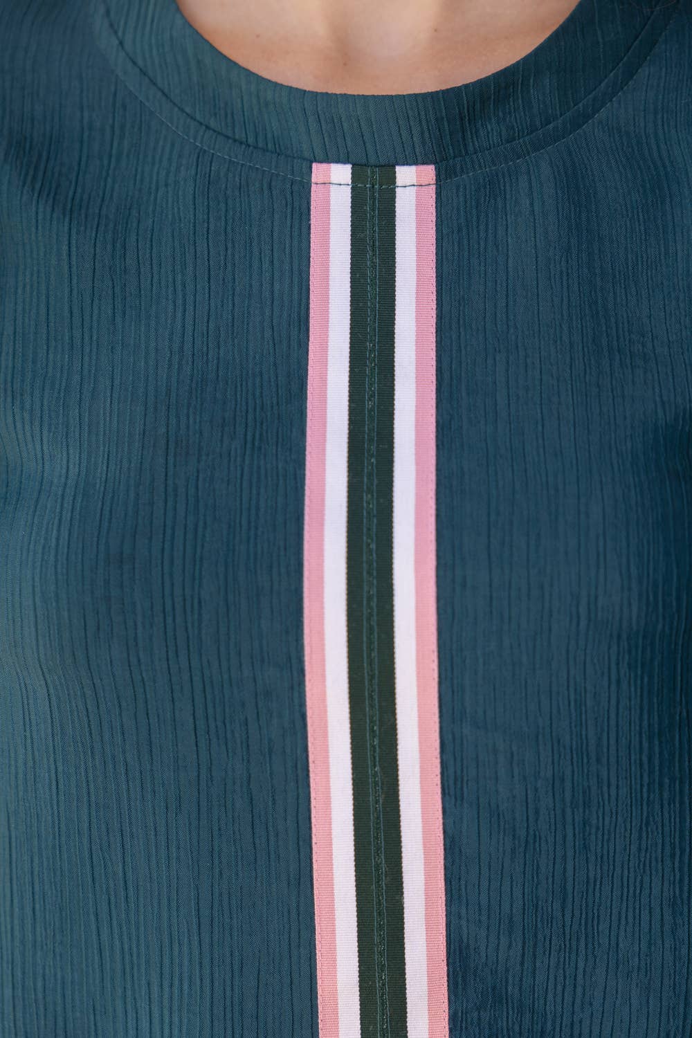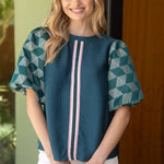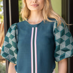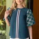 • Round neckline with band • Short bubble sleeve • Multi color striped trim placket detail • Back neck loop and button closure • Textured solid and geometric jaquard contrast woven fabric • Size information: Model height 5' 8”, wearing size Small