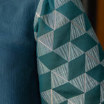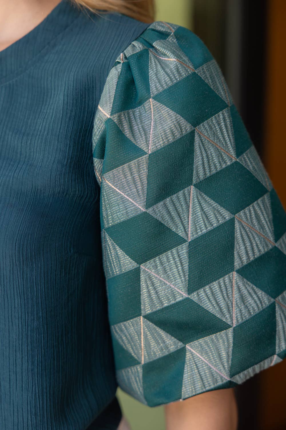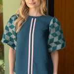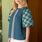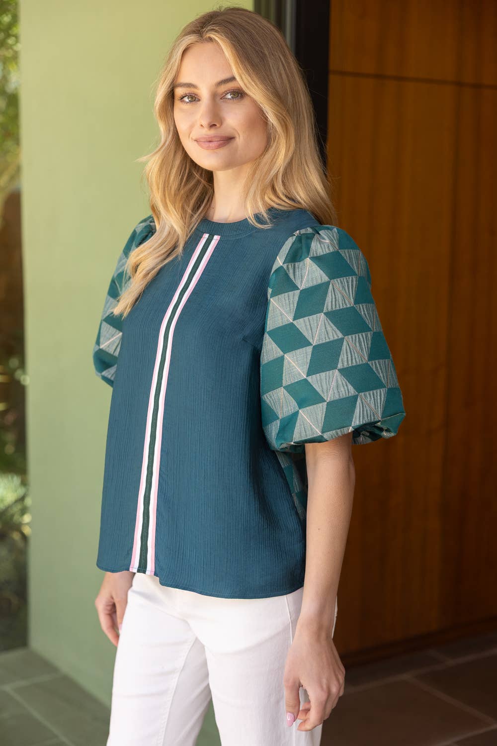 Geometric Jaquard Bubble Sleeve Striped Trim Front Top: Green