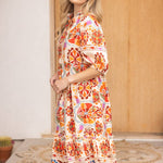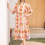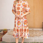 Ruffled Neck Boarder Printed Tiered Midi Dress