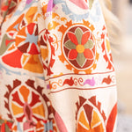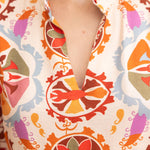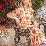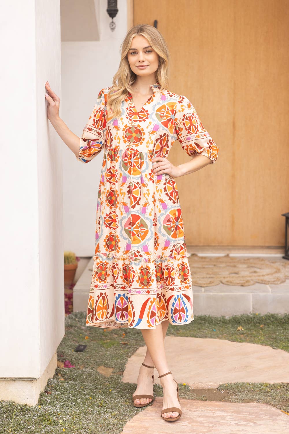 • V ruffled high neckline • Half puff sleeve with elastic finish • Tiered midi length dress • Printed woven fabric • Size information: Model height 5' 8”, wearing size Small