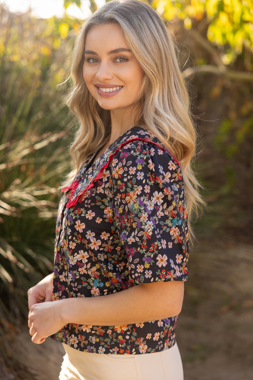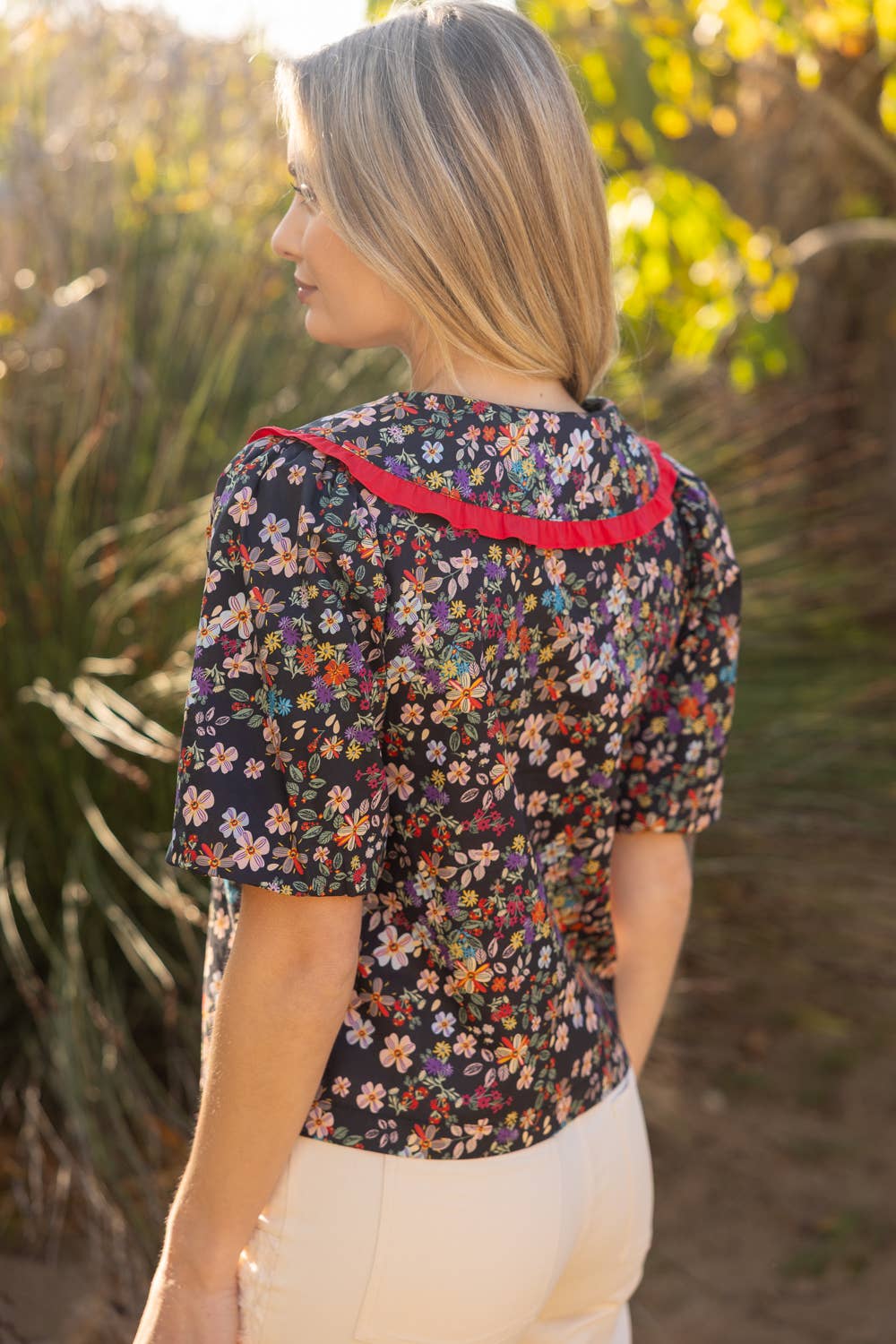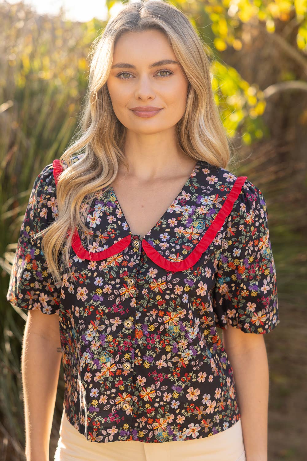 • V-neckline • Short bubble sleeve • Wide collar with frill detail • Front button down closure • Floral print woven fabric Model height 5' 8", wearing size Small. A vibrant floral blouse with bold contrast ruffle collar, puff sleeves, and a feminine button-down silhouette—your must-have statement top for spring and summer collections.