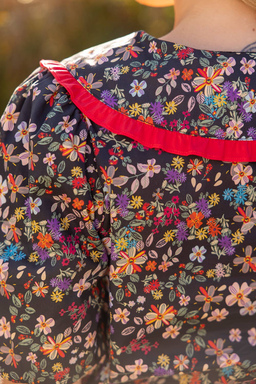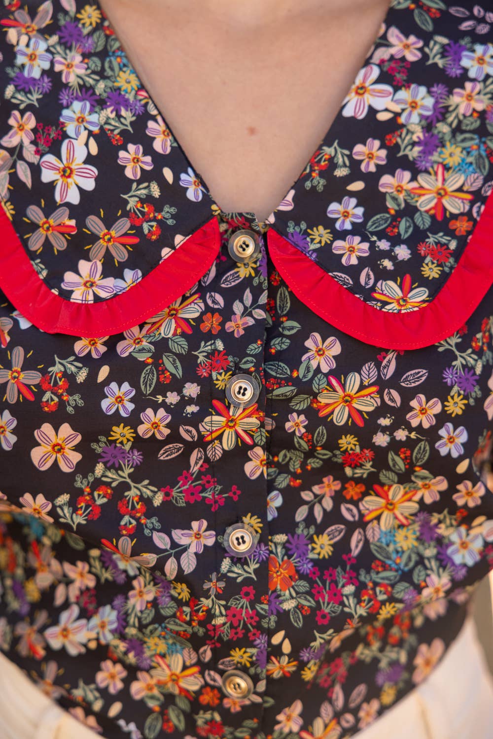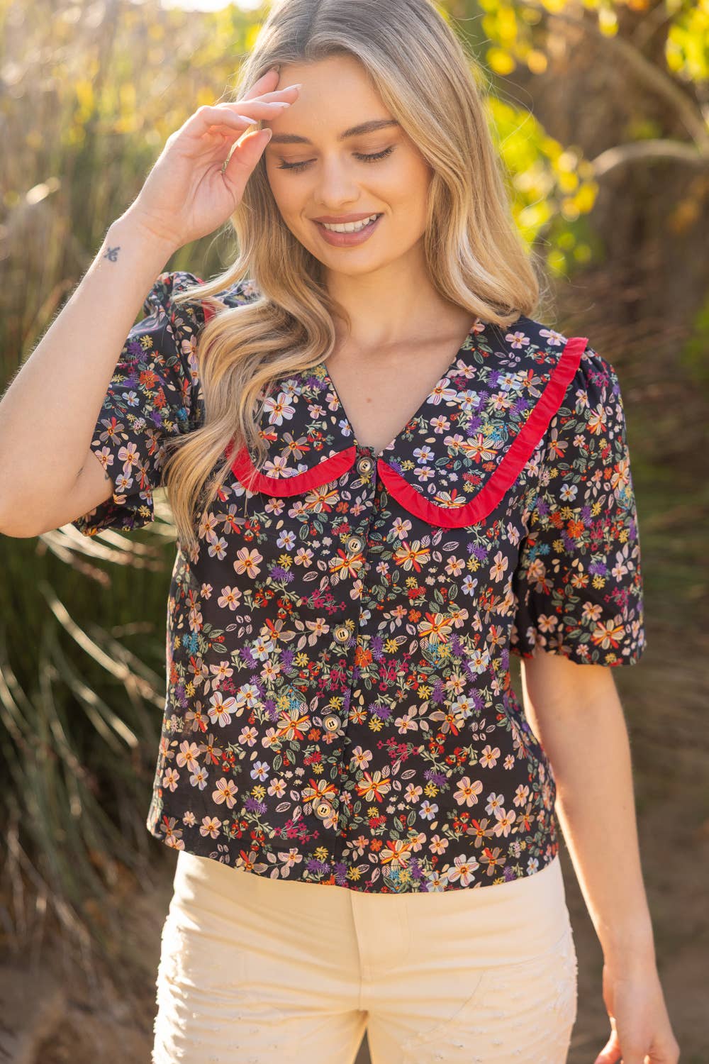 • V-neckline • Short bubble sleeve • Wide collar with frill detail • Front button down closure • Floral print woven fabric Model height 5' 8", wearing size Small. A vibrant floral blouse with bold contrast ruffle collar, puff sleeves, and a feminine button-down silhouette—your must-have statement top for spring and summer collections.