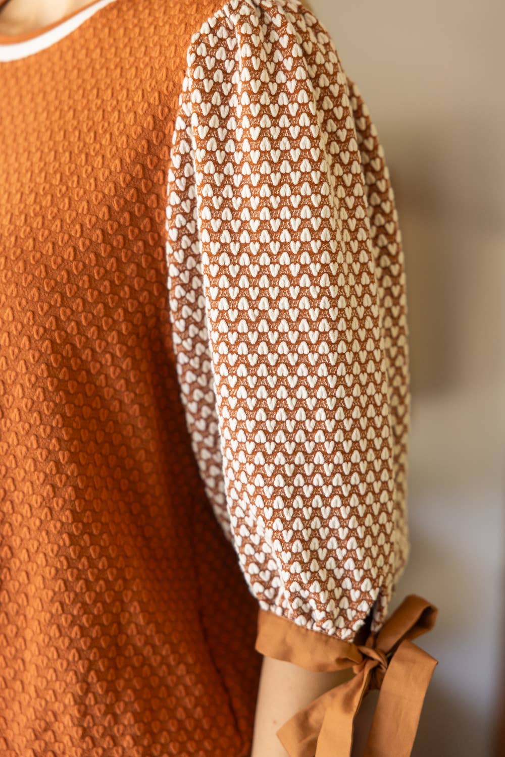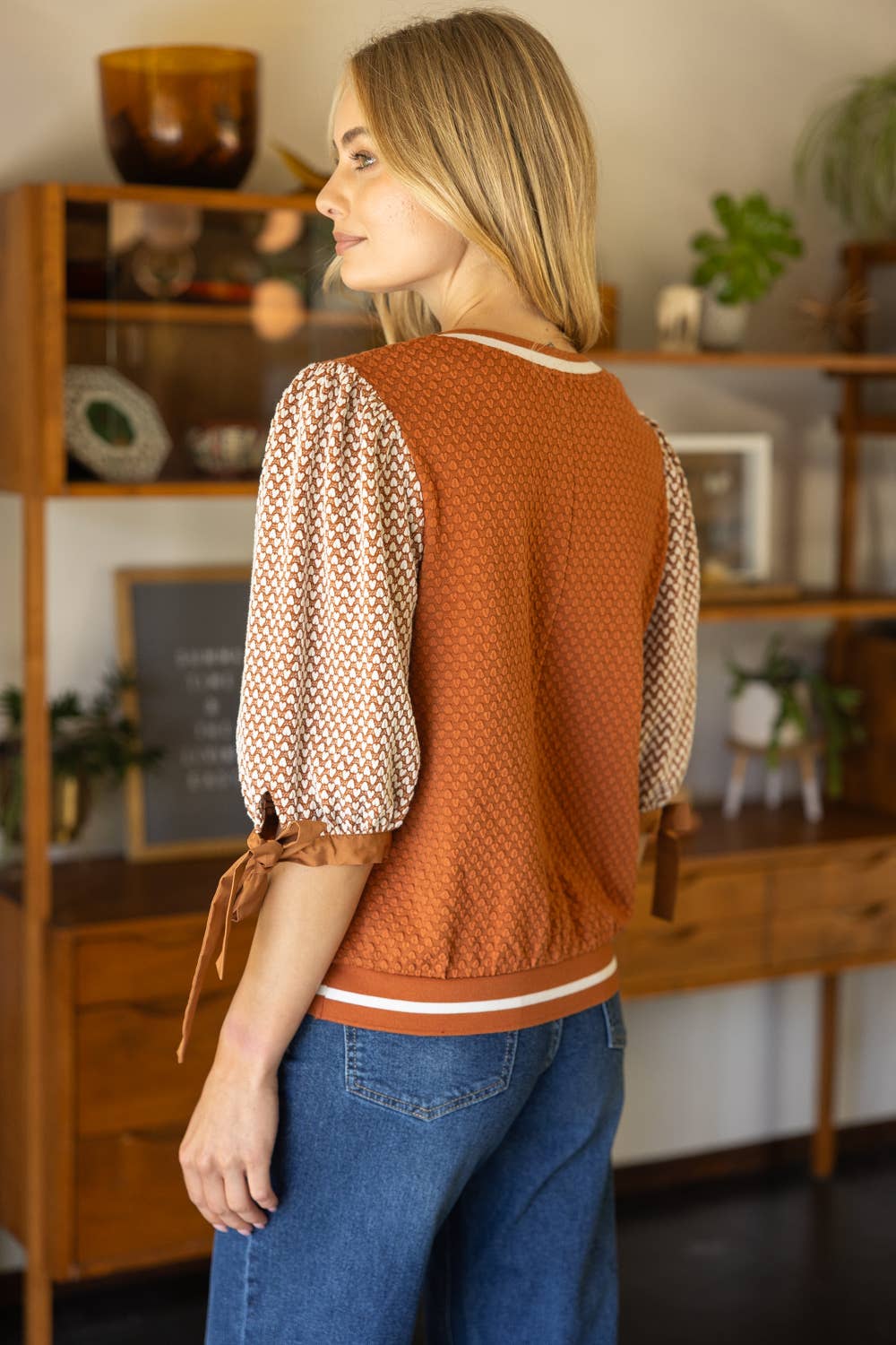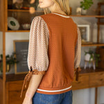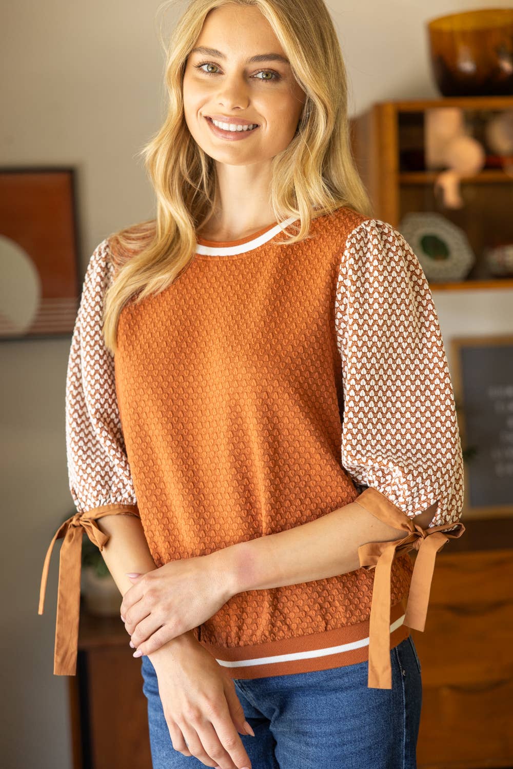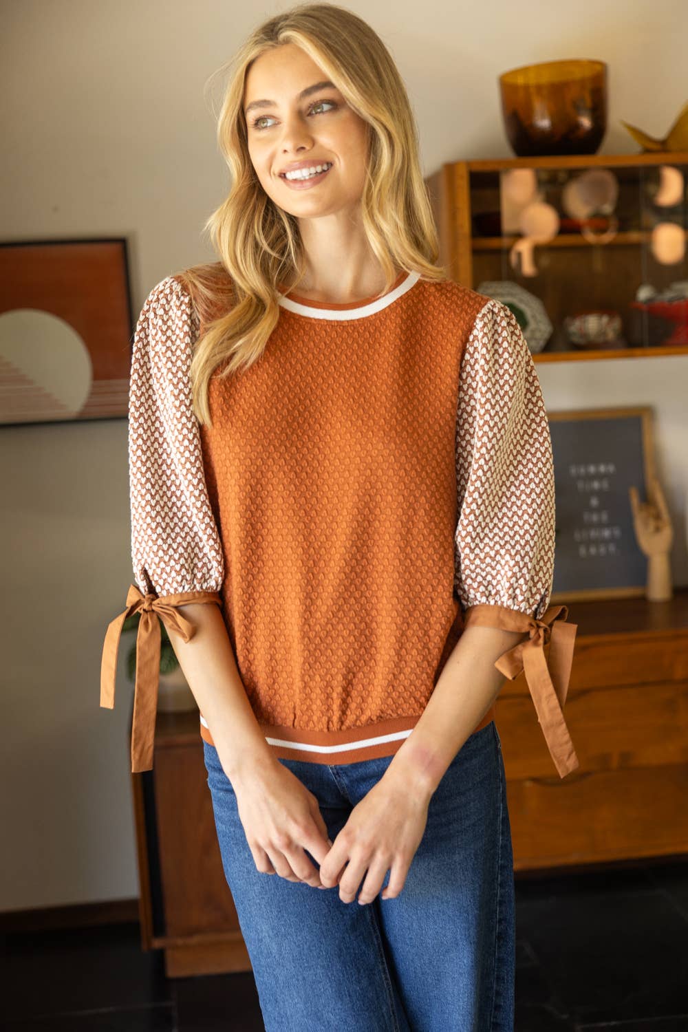 • Round neckline • Three quarter sleeve • Contrast tie bow detail • Striped elastic band hem and neck • Color contrast textured knit fabric • Size information: Model height 5' 8”, wearing size Small