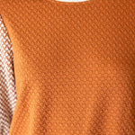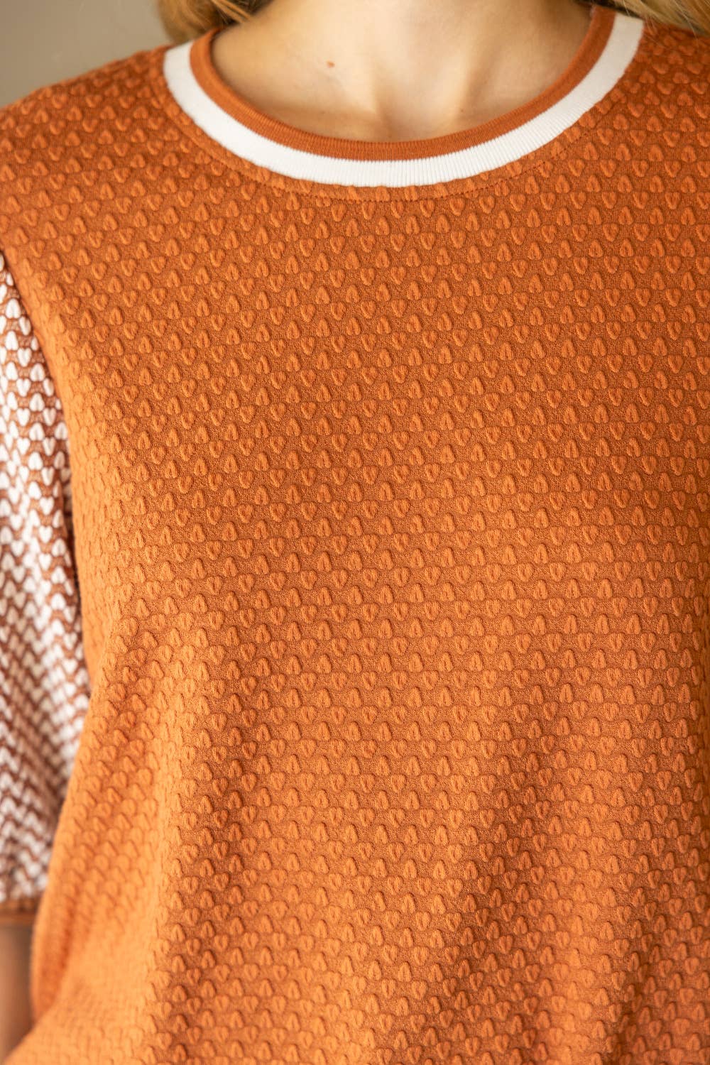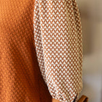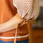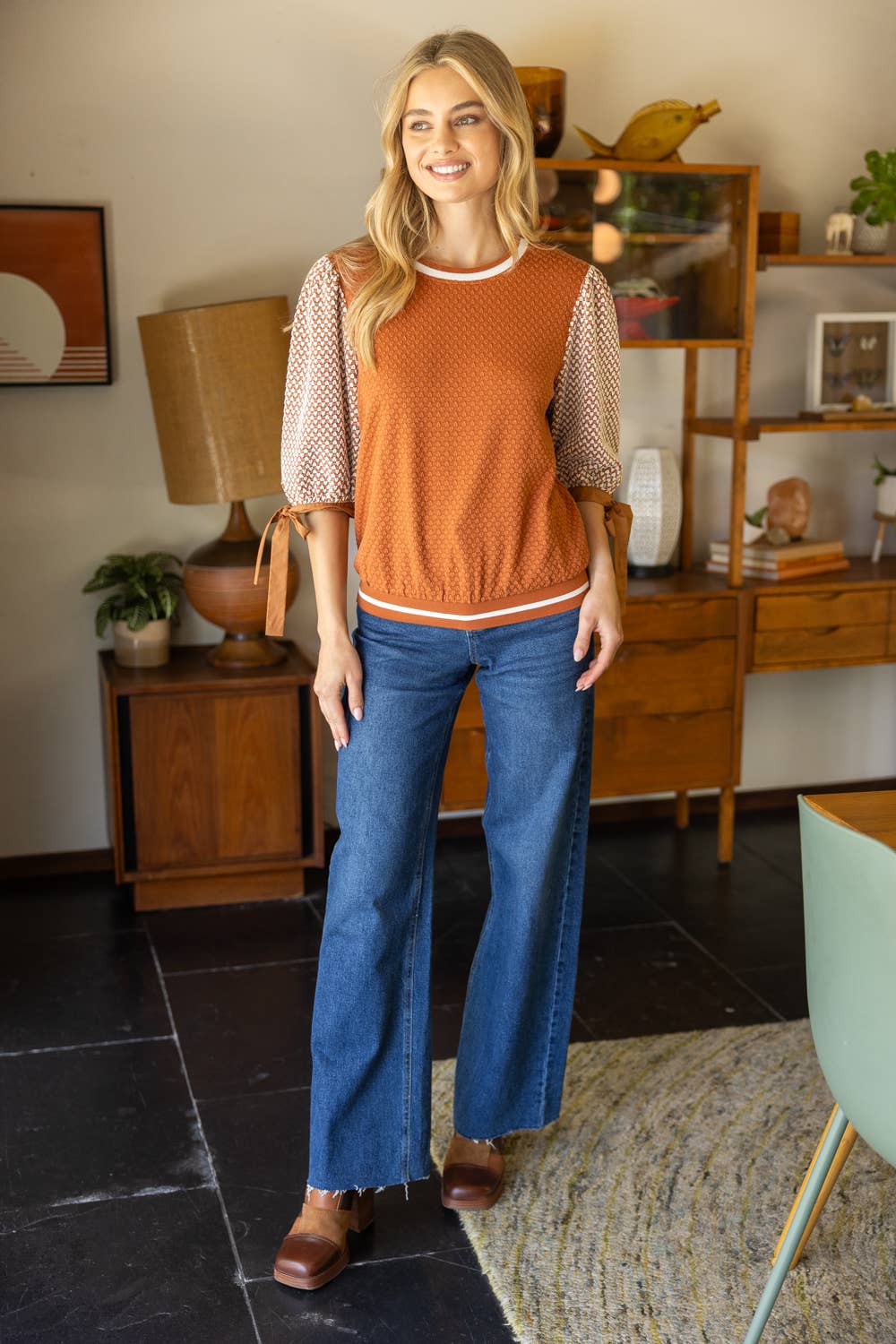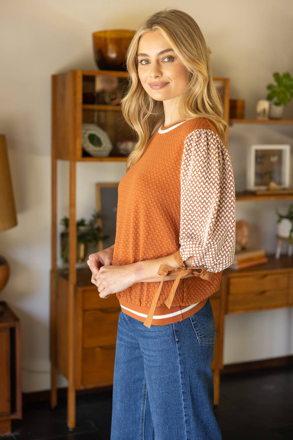 • Round neckline • Three quarter sleeve • Contrast tie bow detail • Striped elastic band hem and neck • Color contrast textured knit fabric • Size information: Model height 5' 8”, wearing size Small