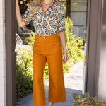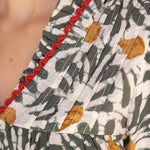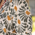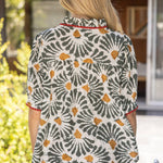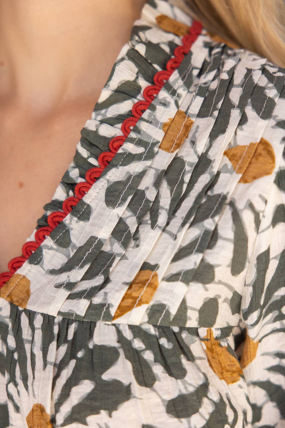 This boho-inspired blouse features an olive green and mustard floral print with a relaxed fit, puff sleeves, and a split neckline trimmed in red for a unique touch. Lightweight and breathable, it’s perfect for spring through fall and easy to style with jeans, skirts, or trousers. A versatile boutique favorite for casual chic and bohemian wardrobes. • V-neckline with wide ruffle • Short puff sleeve • Pintuck detailed front yoke • Contrast scallop trim on neck and cuff • Floral woven fabric • Size information: Model height 5' 8”, wearing size Small
