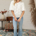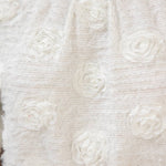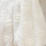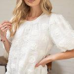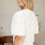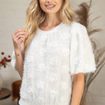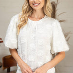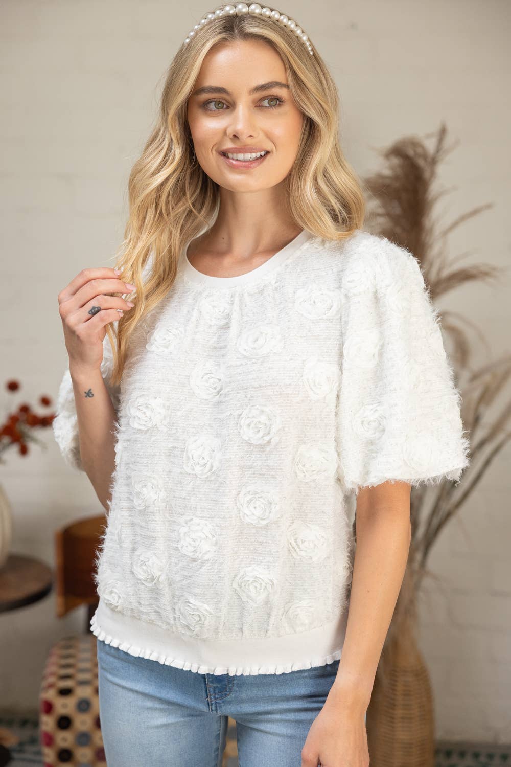 • Round neckline • Short bubble sleeve • Ribbed ruffle trim on cuff and hem • 3D textured flowers • Metallic soft fur fabric • Size information: Model height 5' 8”, wearing size Small