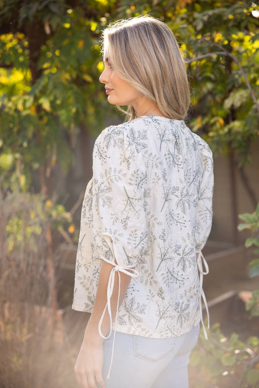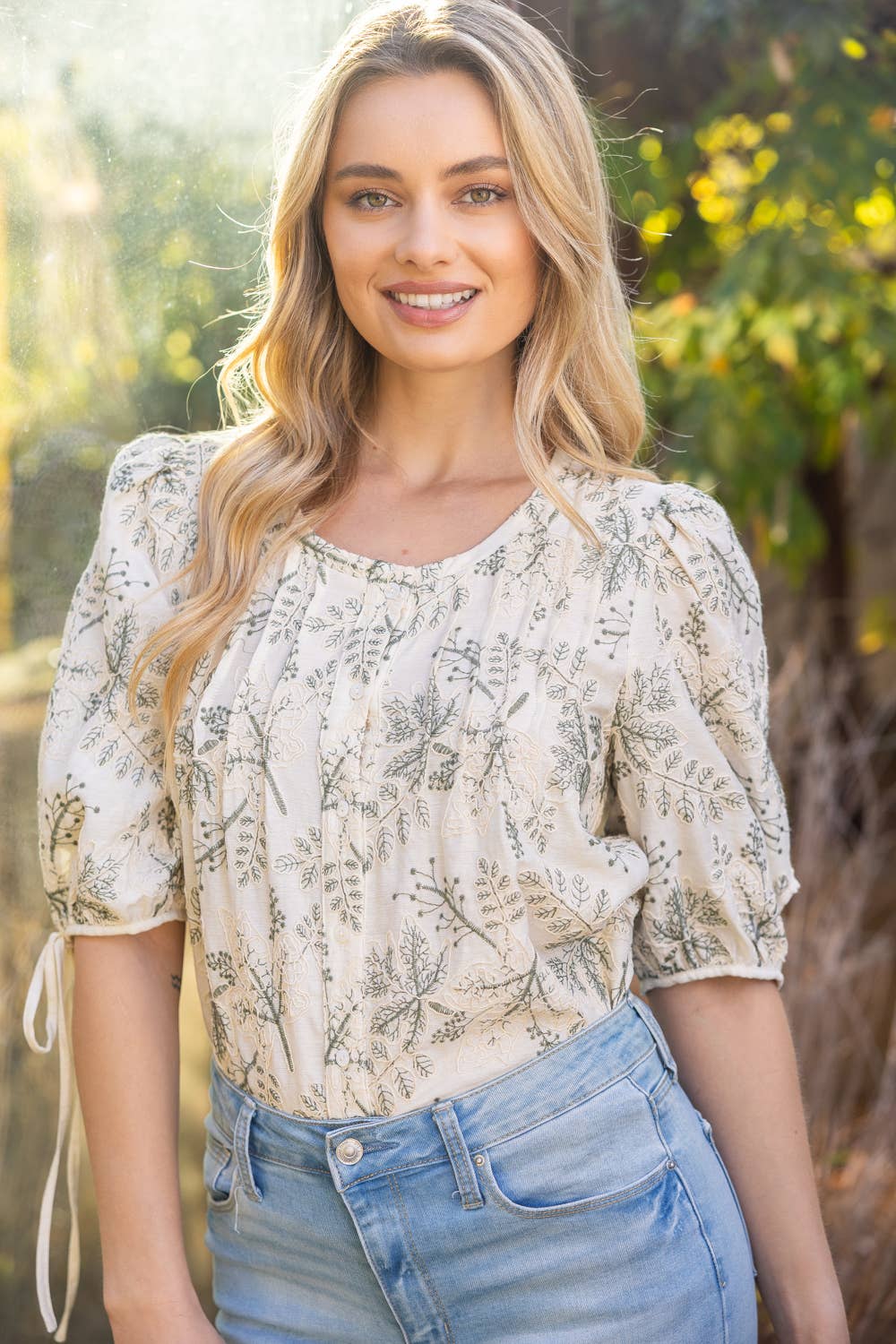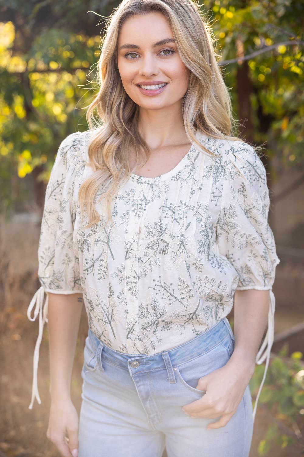 • Round neckline • Half sleeve • Contrast spaghetti strap tie on cuff • Pintucked yoke detail • Floral embroidery woven fabric Model height 5' 8", wearing size Small. A soft botanical embroidered blouse featuring puff sleeves with adjustable ties, pintuck details, and a relaxed feminine silhouette. Lightweight and airy-perfect for spring and summer styling.