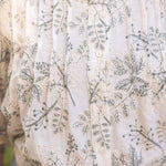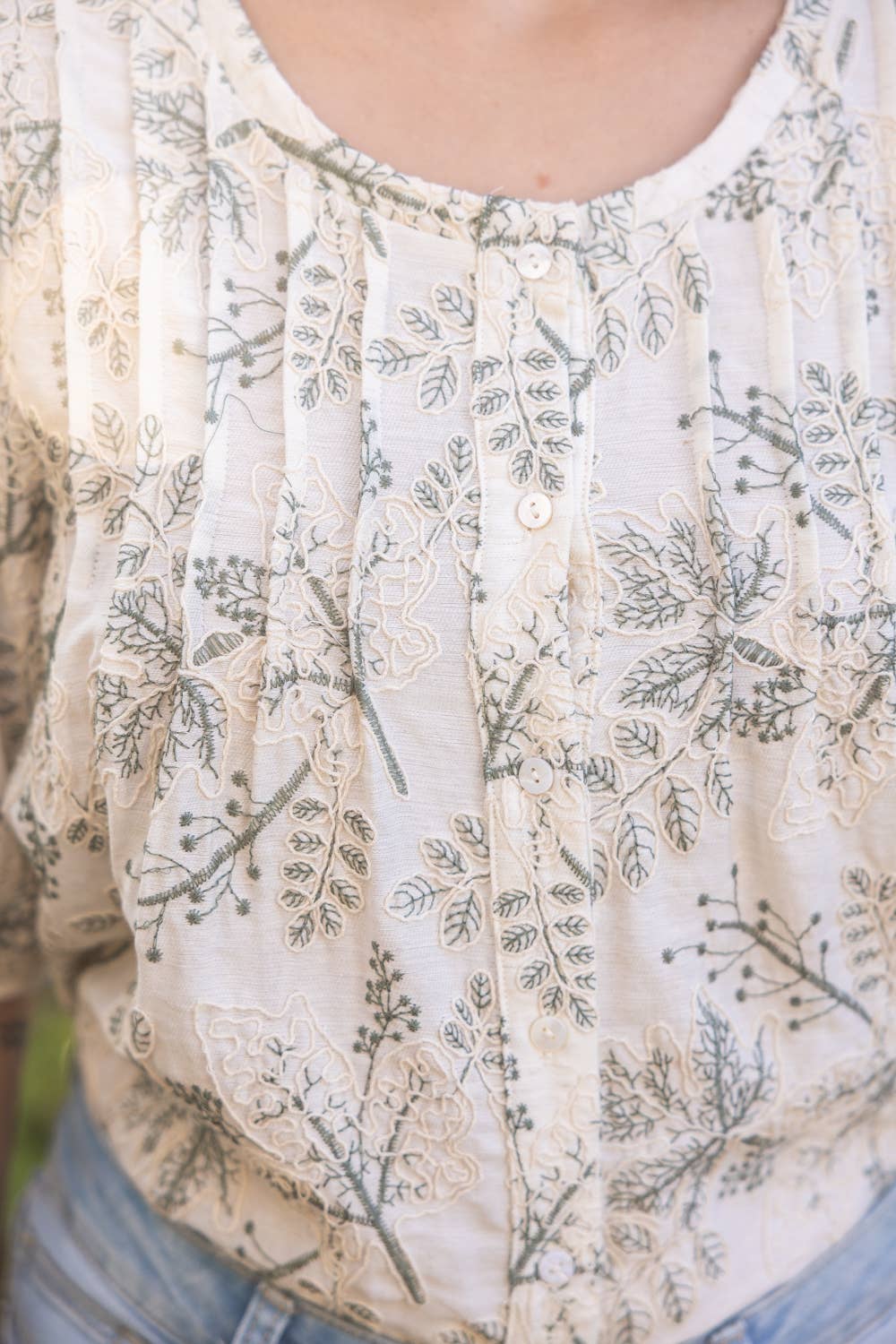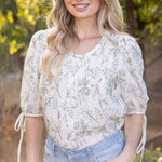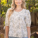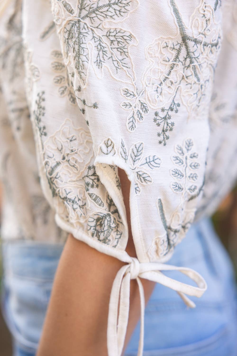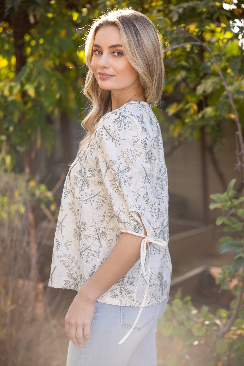 • Round neckline • Half sleeve • Contrast spaghetti strap tie on cuff • Pintucked yoke detail • Floral embroidery woven fabric Model height 5' 8", wearing size Small. A soft botanical embroidered blouse featuring puff sleeves with adjustable ties, pintuck details, and a relaxed feminine silhouette. Lightweight and airy-perfect for spring and summer styling.