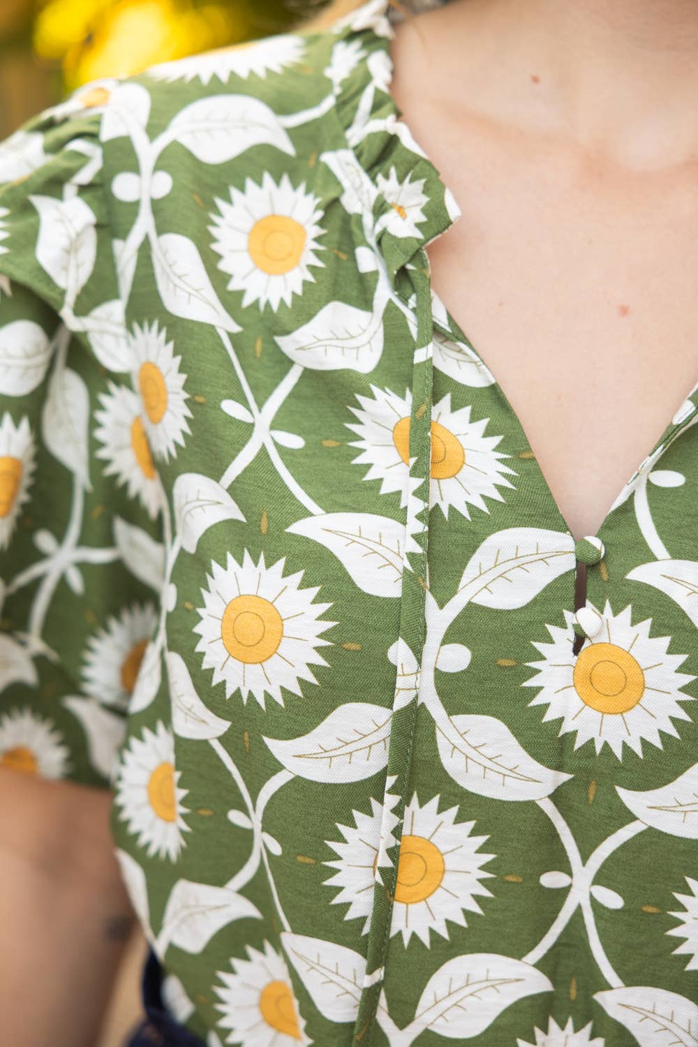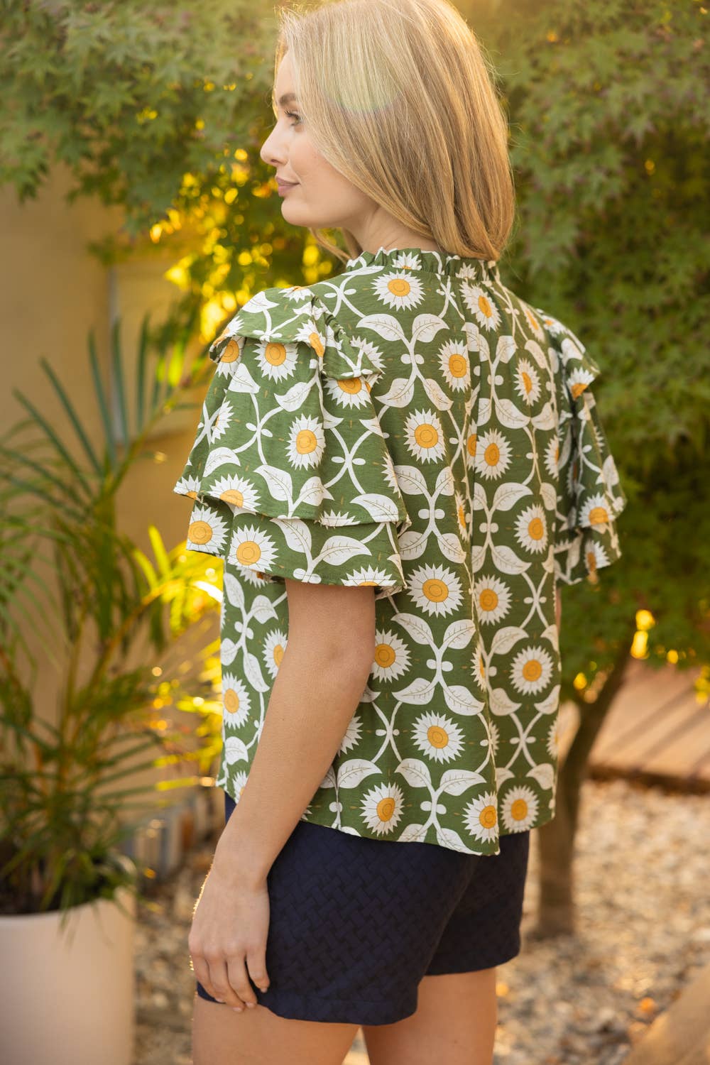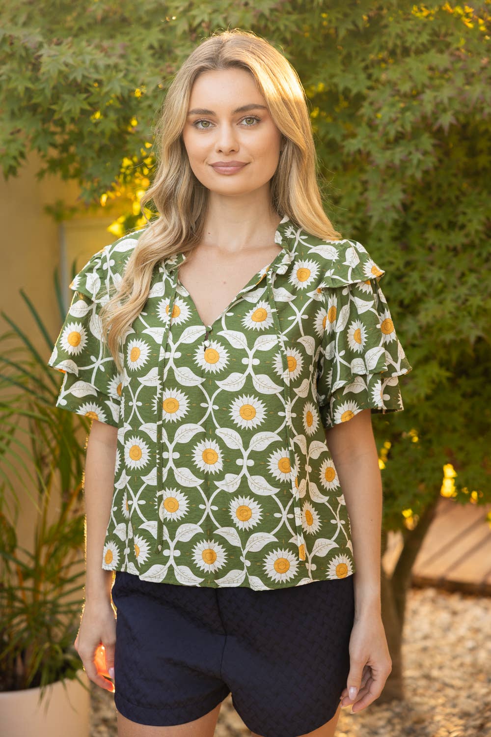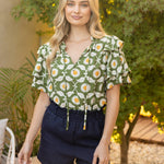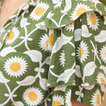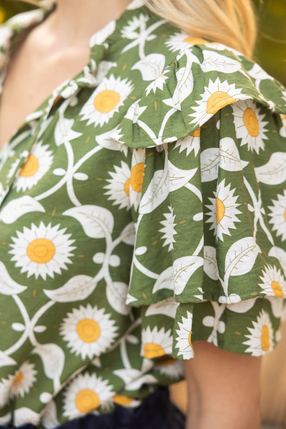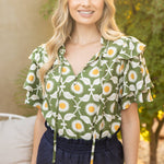 Brighten your wardrobe with this charming floral top, showcasing a delightful daisy print in soft green tones. The playful design features distinctive tiered ruffles on short sleeves and a relaxed neckline, while a self-tie front adds an extra touch of whimsy. Crafted from soft woven fabric, it's the perfect piece for carefree spring and summer days. Model wears size Small at 5'8". Available in S-M-L sizing.