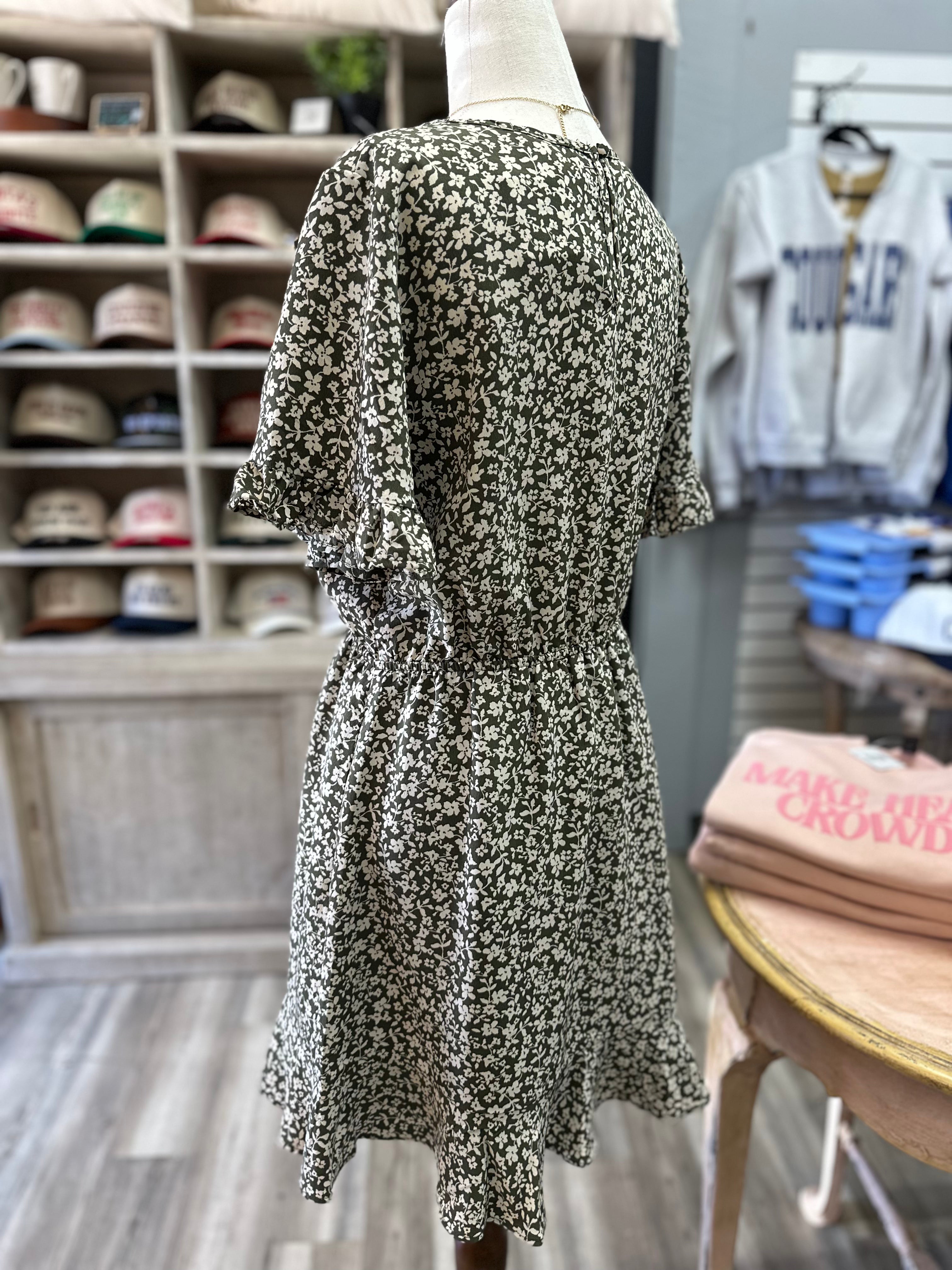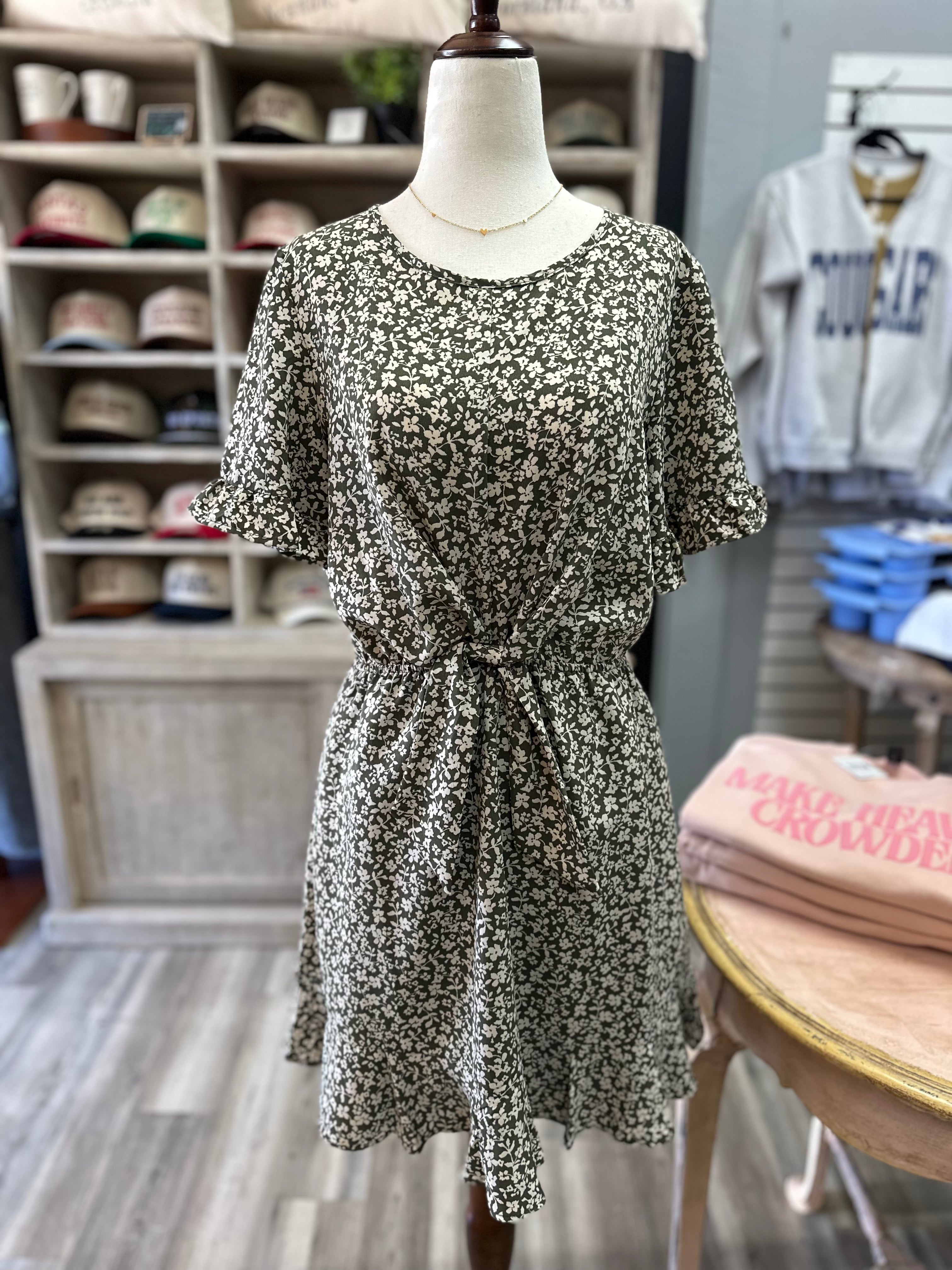 Make a statement in this vibrant green floral dress, complete with a charming tie-front detail. Perfect for adding a pop of color and personality to your everyday style, this playful piece brings botanical beauty and effortless elegance wherever you go.