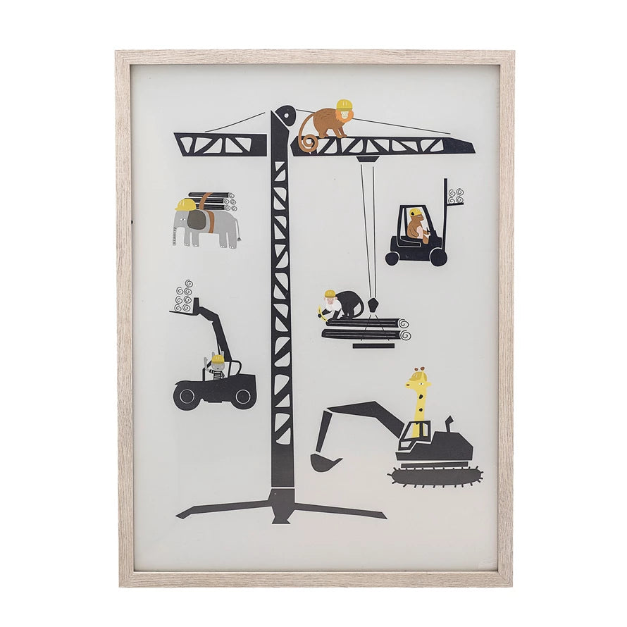 Children love to build and what better help than working alongside fun-loving animals. Spur a child's imagination with this construction wall art. Place near a shelf or table with construction toys of the same type in the picture.