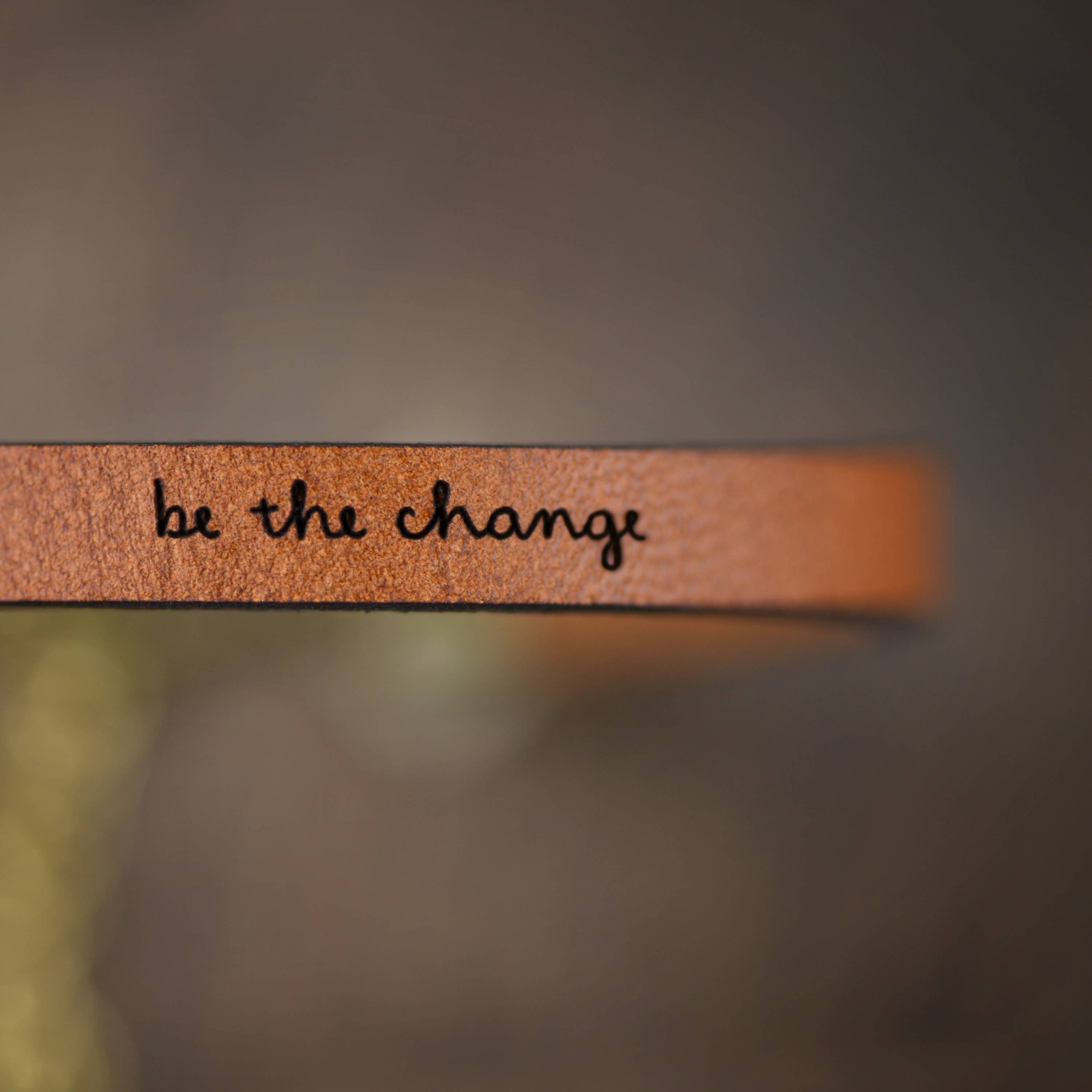 This bracelet reads "be the change" in laurel's original lower case script writing. Leather is approximately 2mm thick // Bracelet is 1/4-inch wide -- the writing very small and delicate // See sizing selections for length details (all include extender chain) // Metal details made from brass // All handmade and sourced in the US