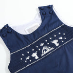 Christmas with our Blue Nativity Smocked Overalls. Made from 100% cotton, these classic blue overalls feature a beautifully smocked panel with embroidered Nativity scenes, depicting Mary, Joseph, and Baby Jesus beneath a shining star. Adjustable shoulder buttons provide a perfect fit, while snaps at the crotch make dressing and diaper changes easy. Perfect for holiday photos, church events, or festive gatherings, these overalls bring timeless charm and heartfelt spirit to your little one’s Christmas wardrobe.