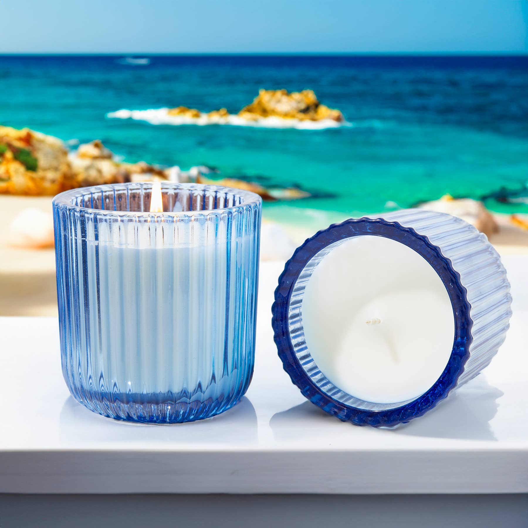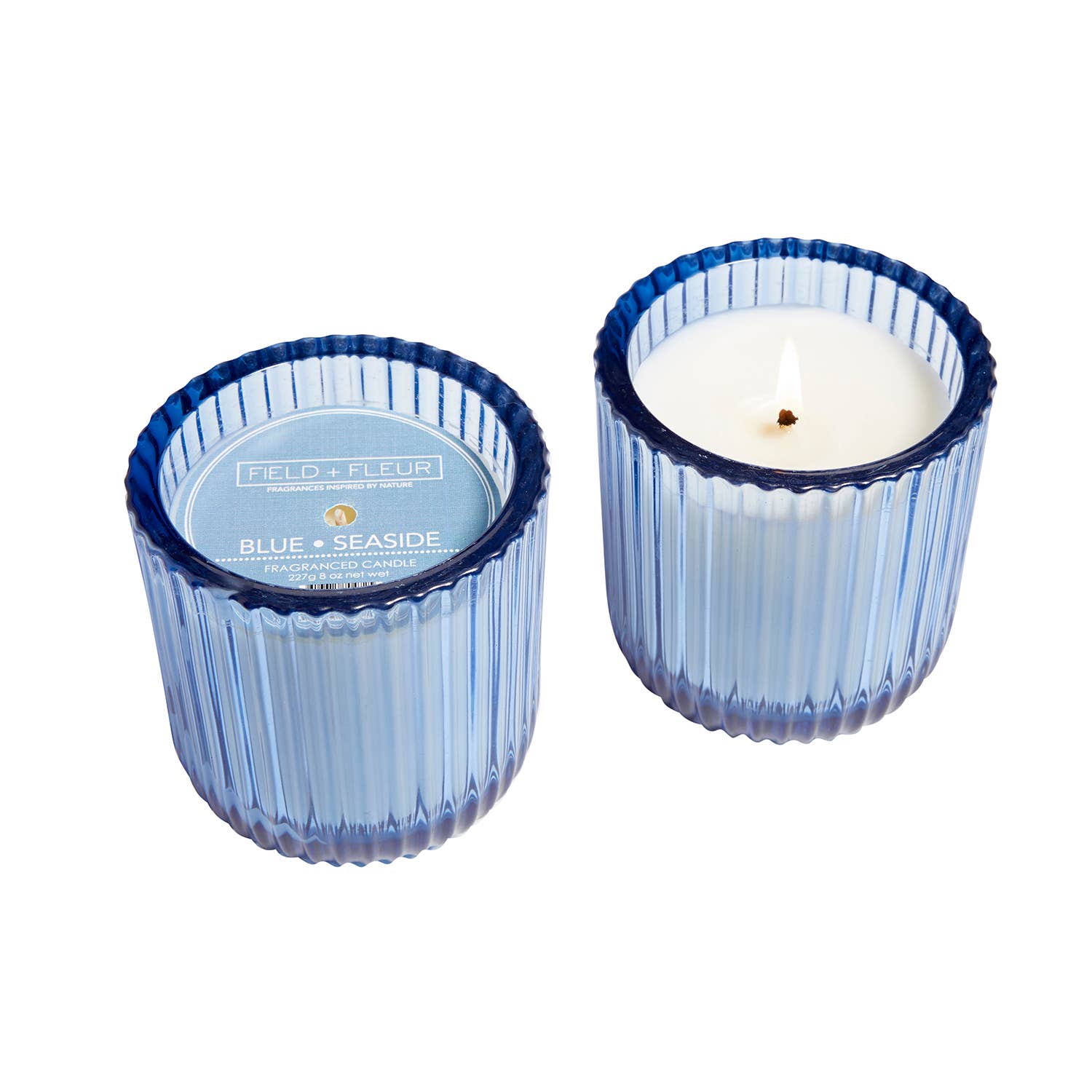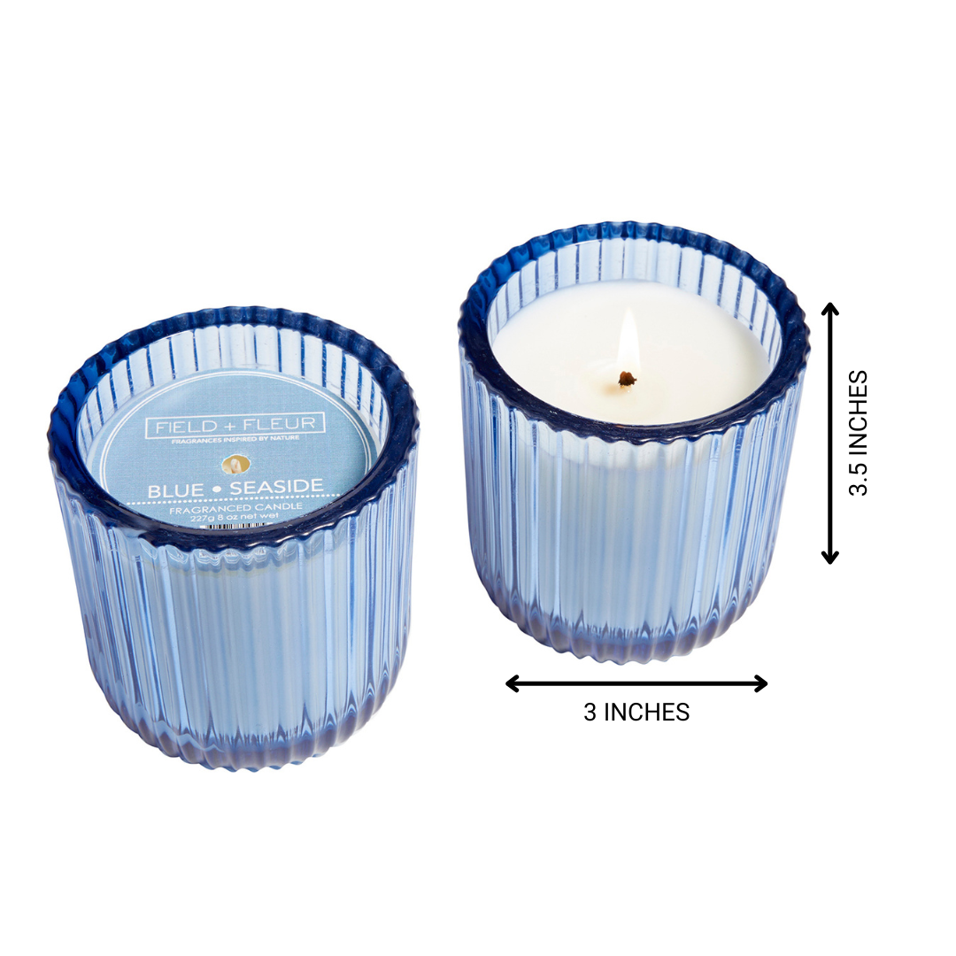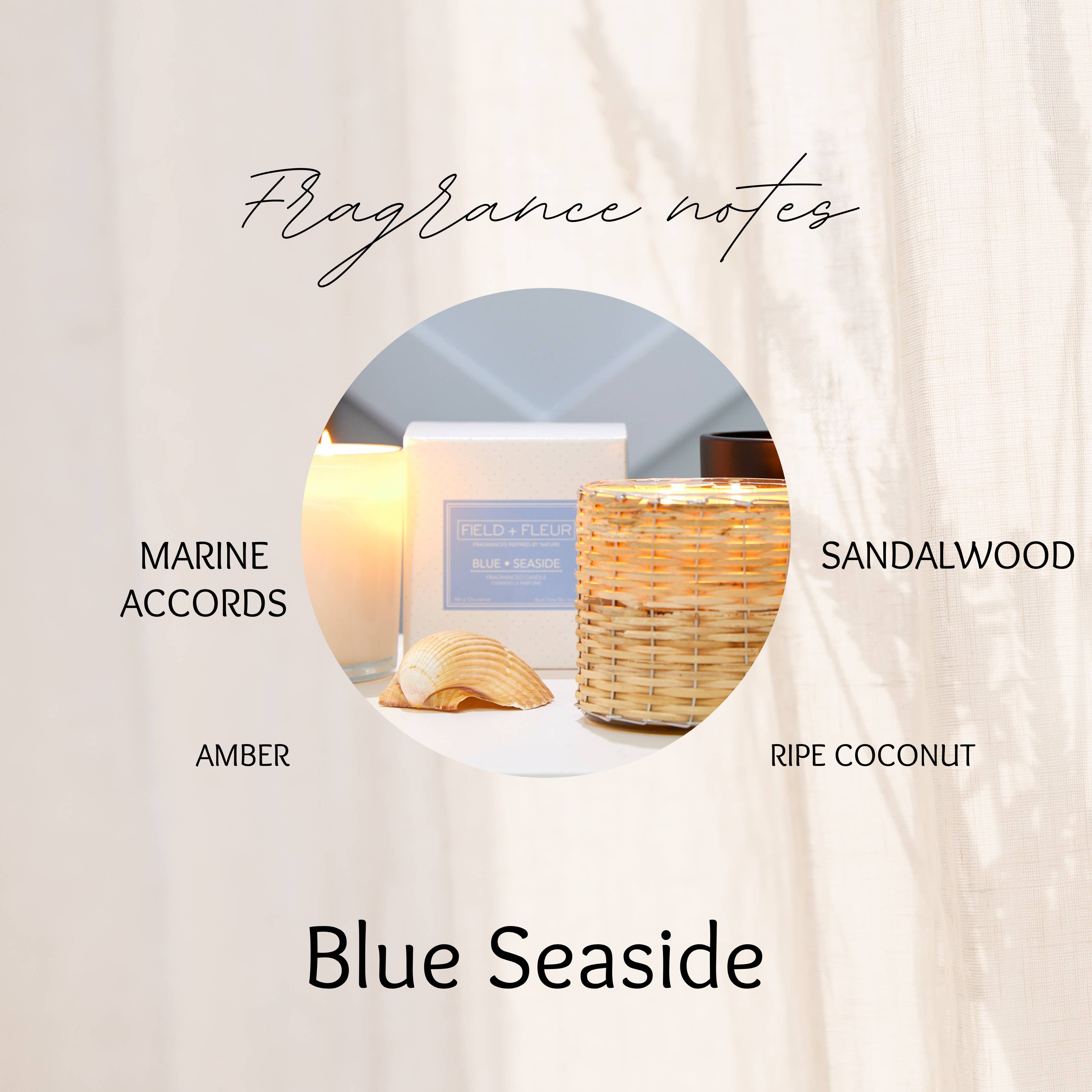 Blue Seaside captures a day at the beach with tangy citrus notes, marine accords and ripe coconut. A hint of summer florals rest on a base of warm amber, musk and a touch of spicy sandalwood. Burn time 50+ hours. Made in the USA.
