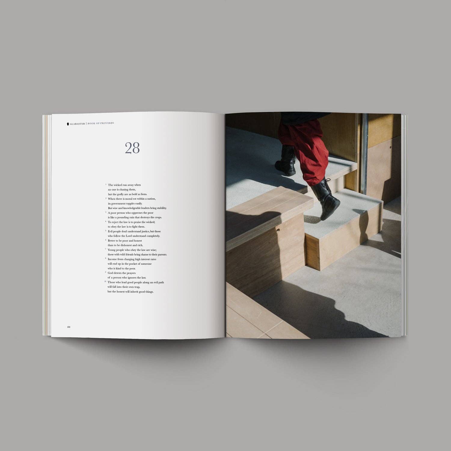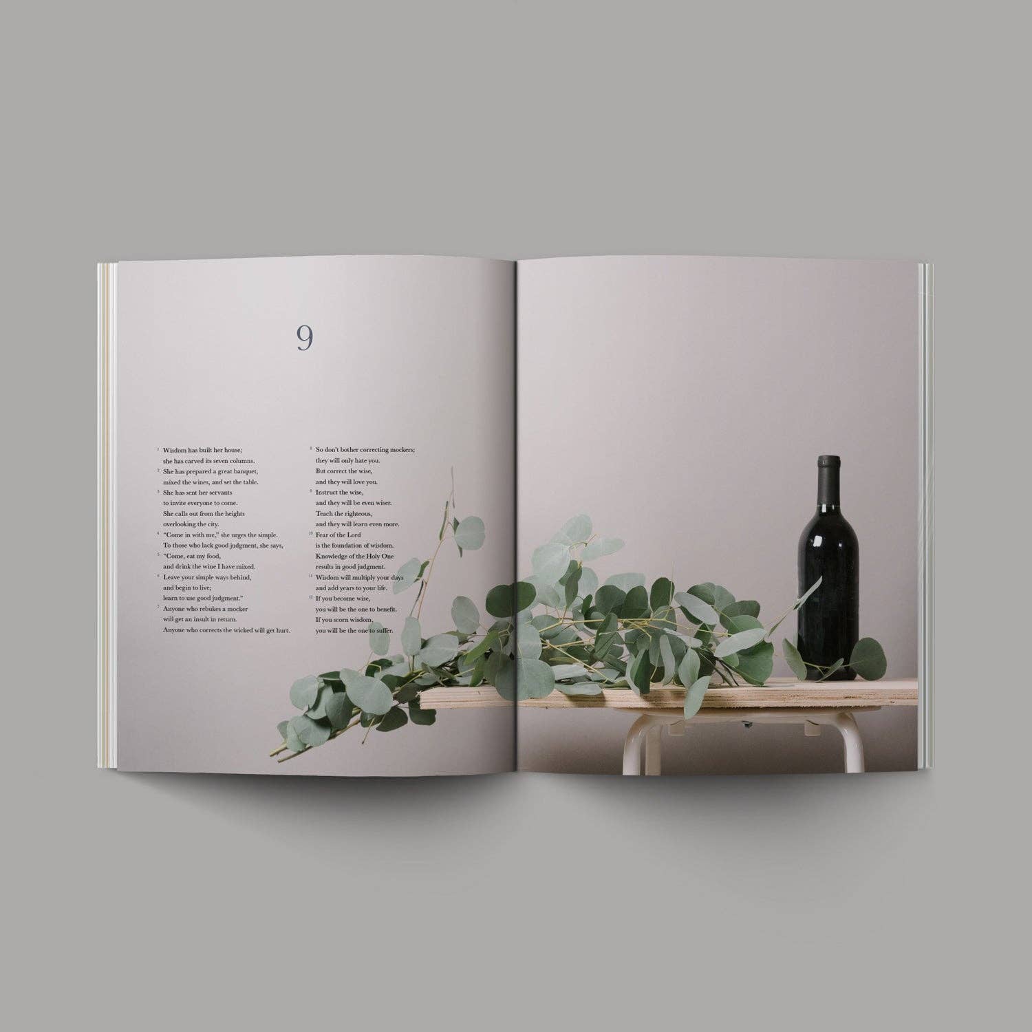 Design Aspects: This book is softcover, 120 pages, perfect bound, and printed in full color on uncoated paper in Canada. The dimensions are 7.5 in x 9.5 in. NLT translation.