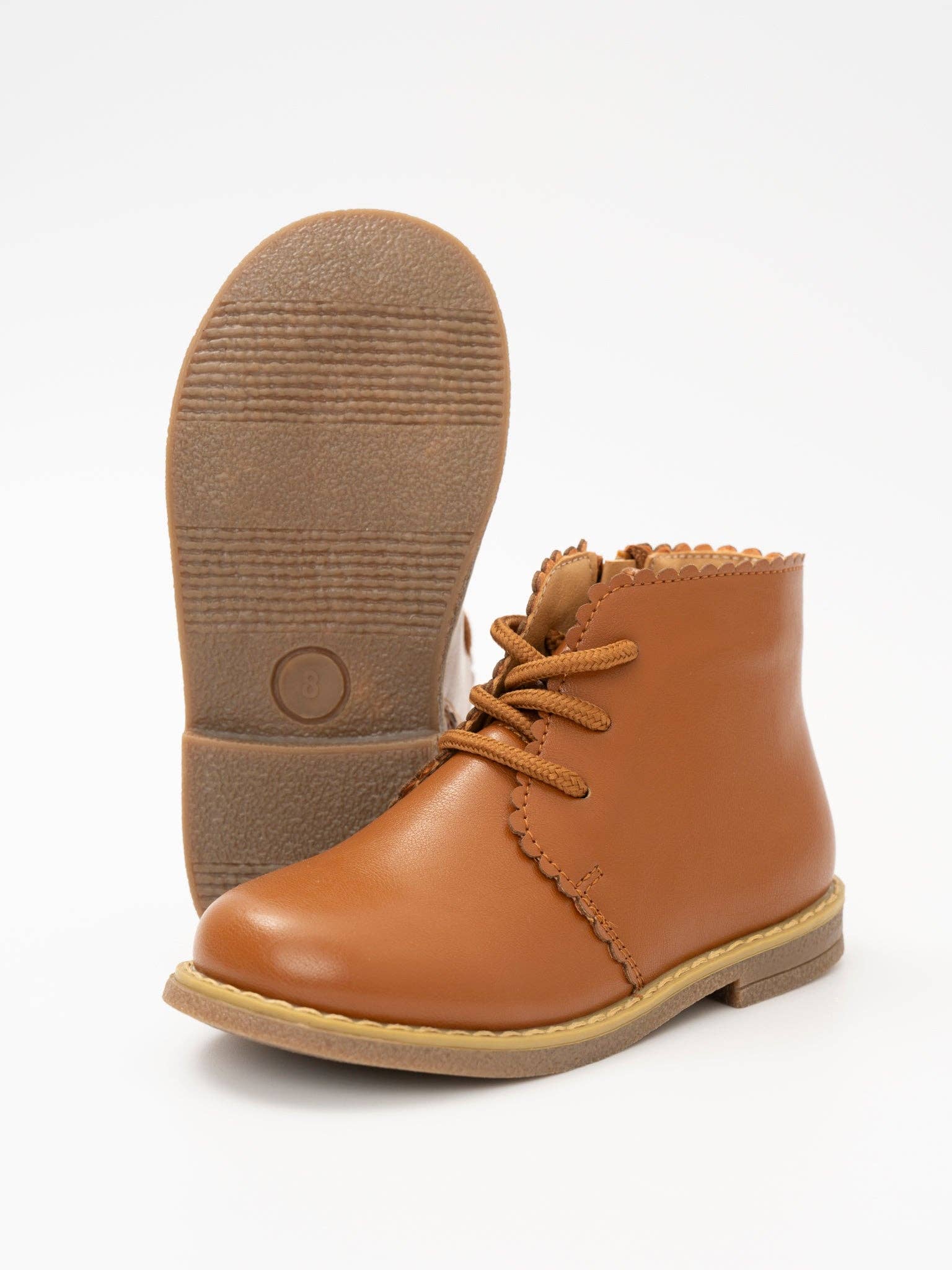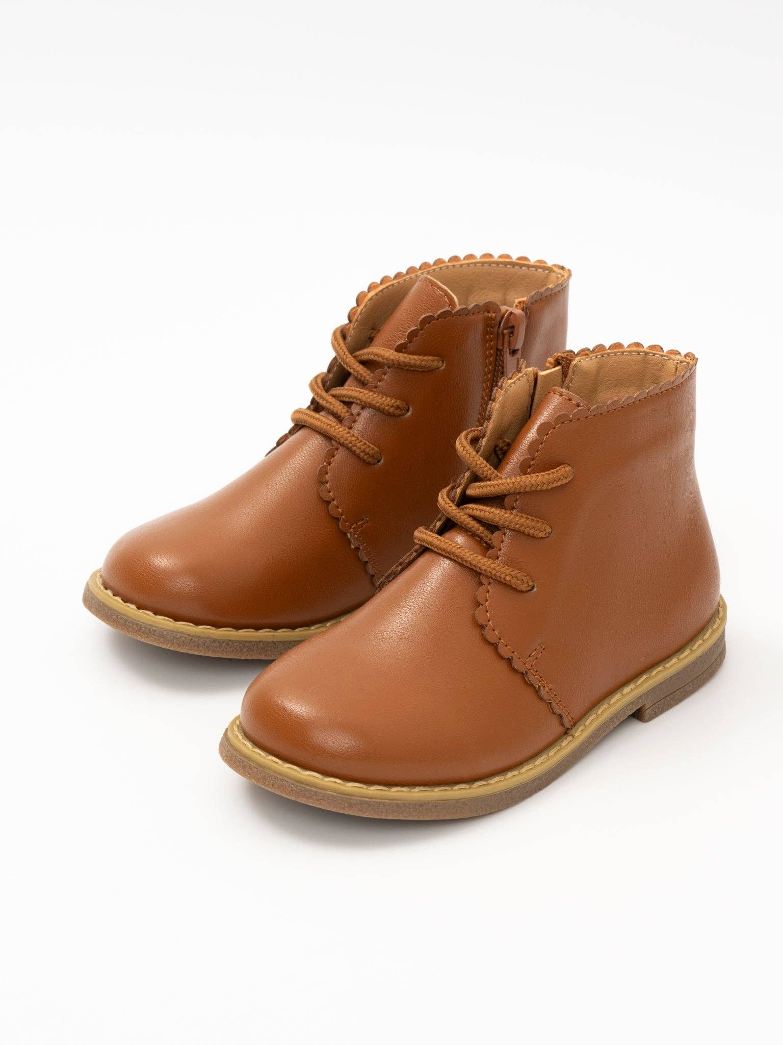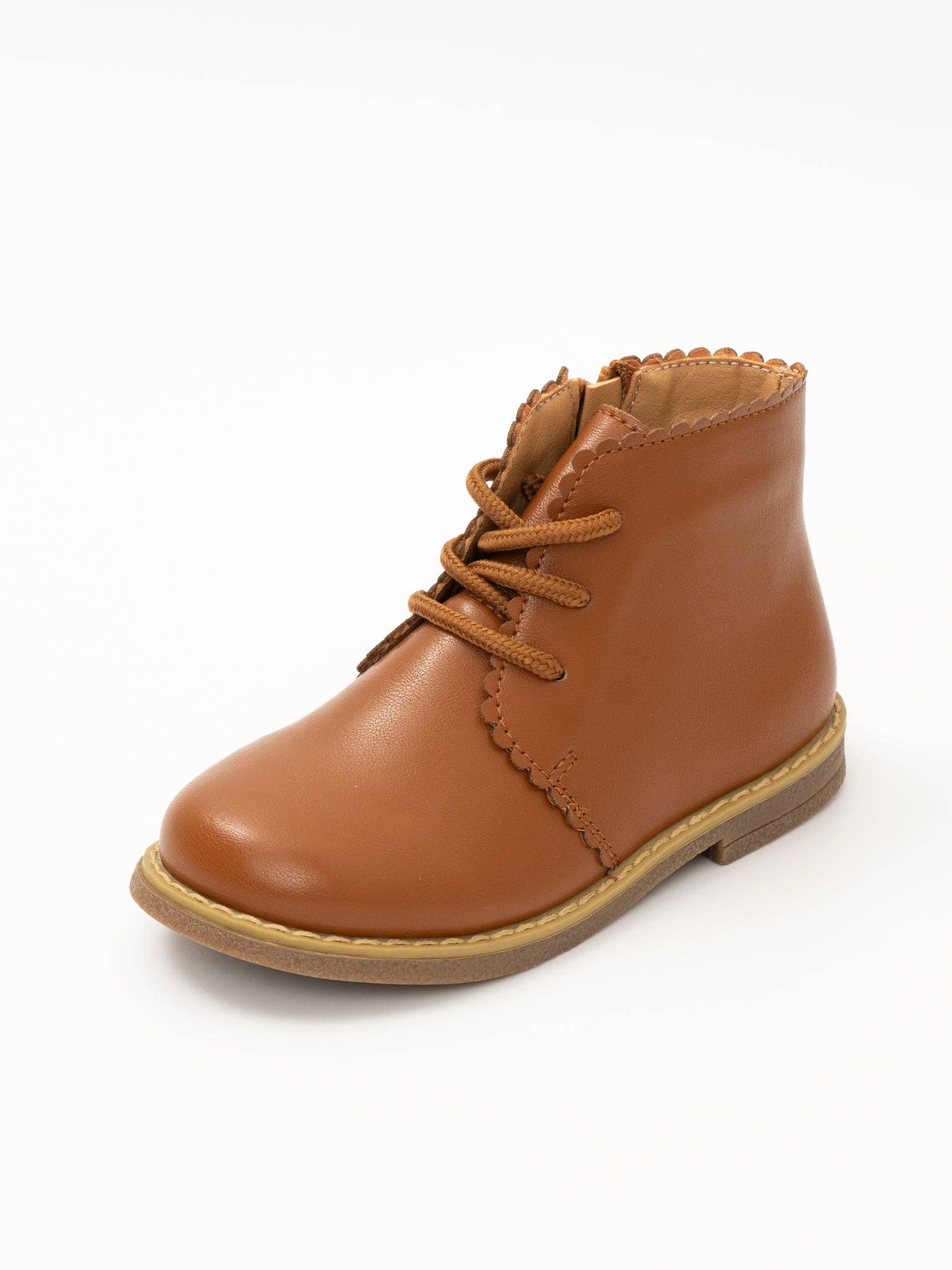 Step into style with our Cinnamon Scallop Trim Boot. Made of leather-like material, this girl's boot features a unique scallop trim and is exclusive to MNC. Perfect for adding a touch of charm to any outfit. * Fit: For best fit, measure your child's foot from heel to length of the longest toe. Our size guide shows the best size according to your child's foot length. If they are between sizes, we recommend sizing up. * 100% man-made materials * Rubber Sole *
