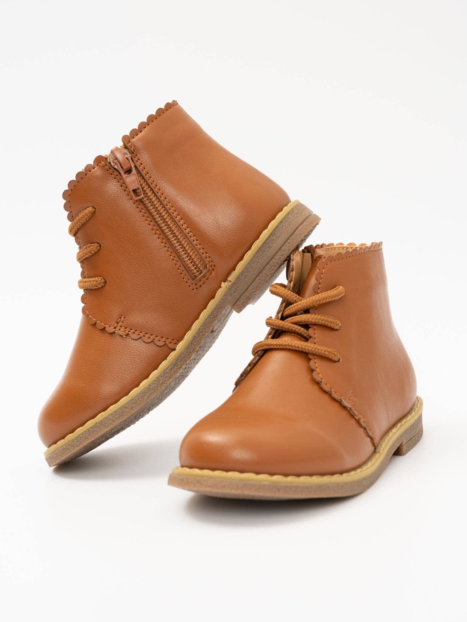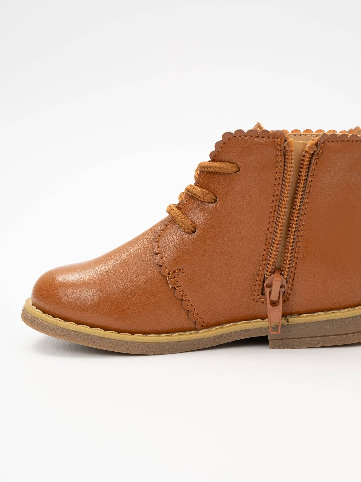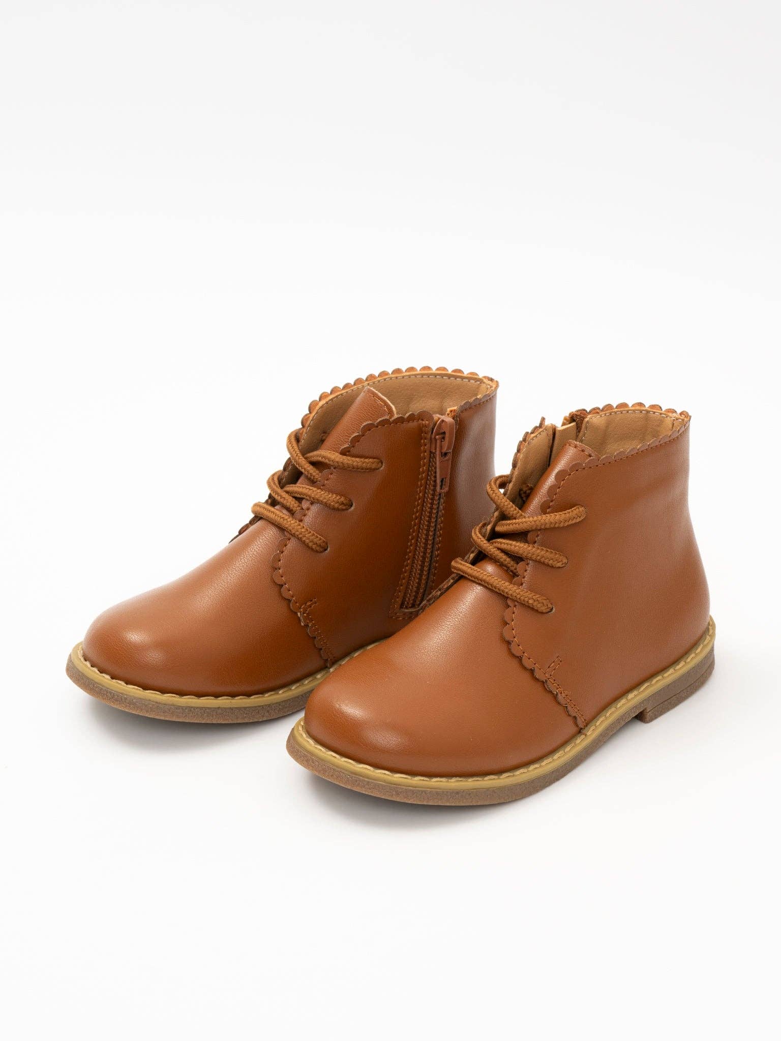 Step into style with our Cinnamon Scallop Trim Boot. Made of leather-like material, this girl's boot features a unique scallop trim and is exclusive to MNC. Perfect for adding a touch of charm to any outfit. * Fit: For best fit, measure your child's foot from heel to length of the longest toe. Our size guide shows the best size according to your child's foot length. If they are between sizes, we recommend sizing up. * 100% man-made materials * Rubber Sole *