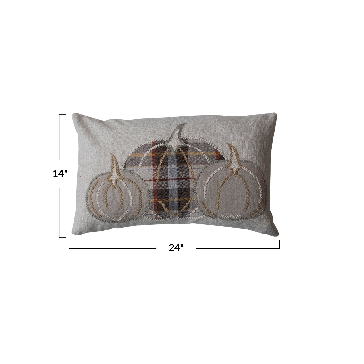 This cotton and linen lumbar pillow is a celebration of autumn, adorned with charming pumpkin appliques set against a natural and multicolor plaid pattern. The chambray back offers a versatile look, while the cotton blend cover ensures a soft touch. Filled with polyester for durability and comfort, this pillow is not only a decorative piece but also a cozy addition to any home looking to embrace the essence of the season. Its generous size makes it an ideal choice for adding a touch of fall's bounty to the living space. Whether it's enhancing a sofa or gracing a favorite chair, this pillow brings the warmth of autumn indoors.
