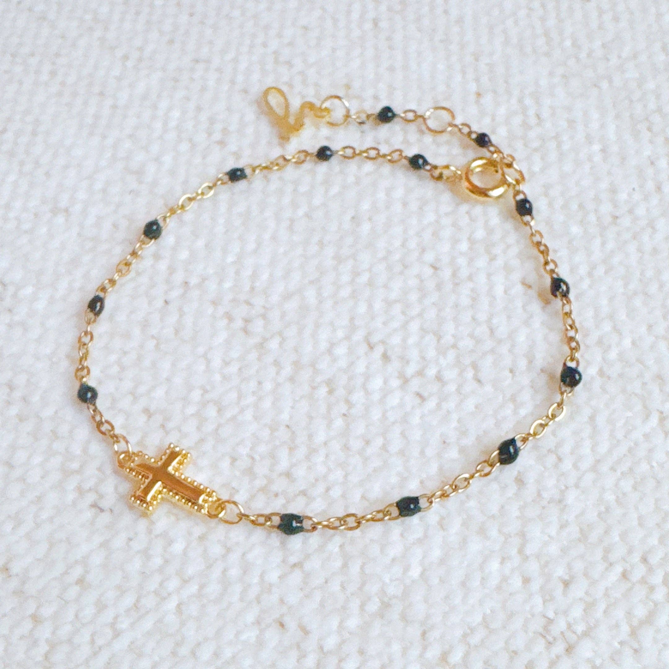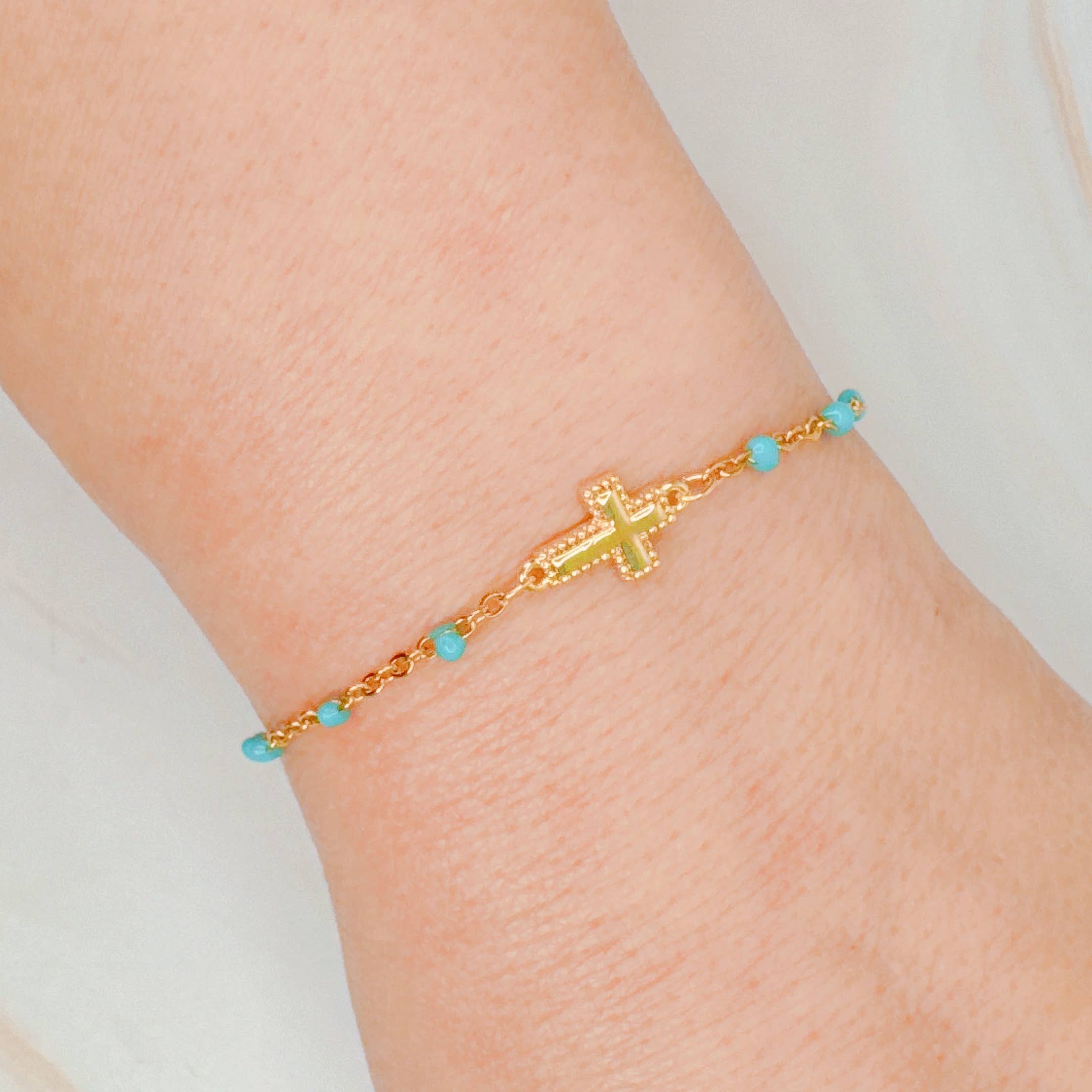 Add a touch of modern elegance to your wrist with this bracelet. The lovely coloring and stylish cross add a charming touch, while the dainty chain design gives a delicate and sophisticated look. Dimensions: Approximately 6.5" with 1" extender 18k gold plated stainless steel, water and tarnish resistant.
