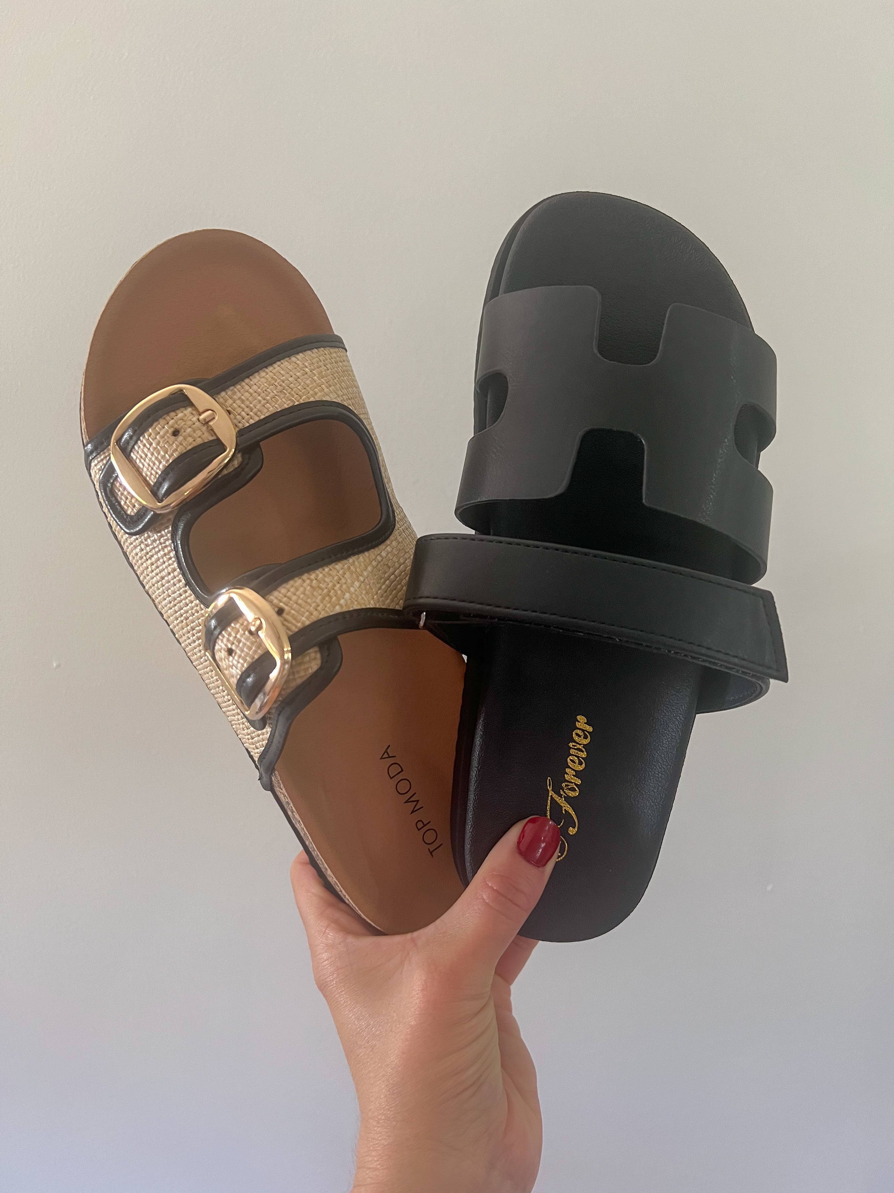 Step into effortless style with these charming double buckle raffia sandals in classic black. The woven raffia upper brings a breezy, textured appeal perfect for warm weather adventures, while the dual buckle straps offer both a fun design detail and secure, adjustable fit. Whether you're heading to the beach, running errands around town, or enjoying a casual weekend, these versatile sandals deliver comfort and character. A timeless wardrobe essential that proves black goes with everything—and looks even better when it's woven!