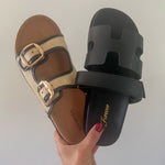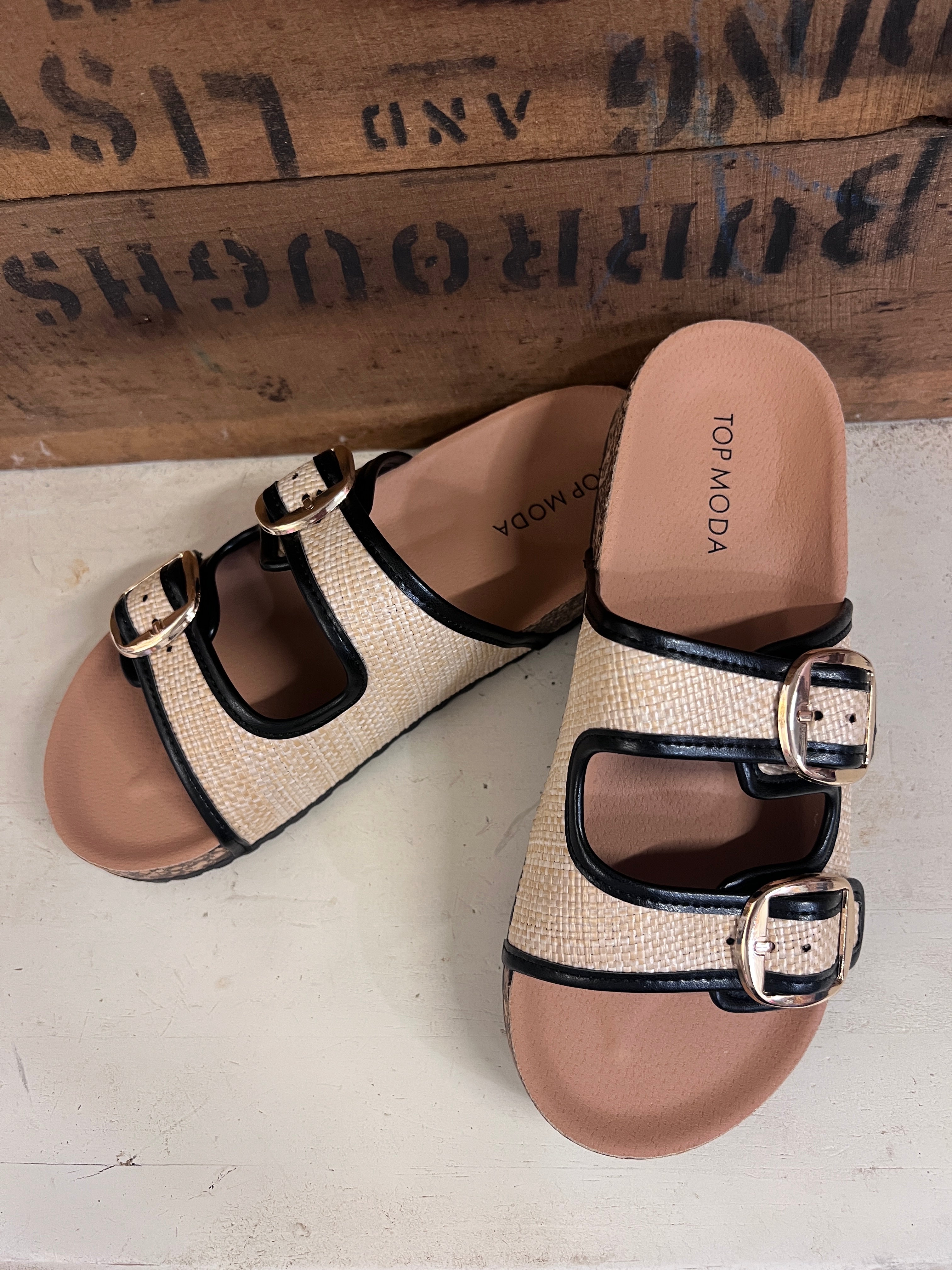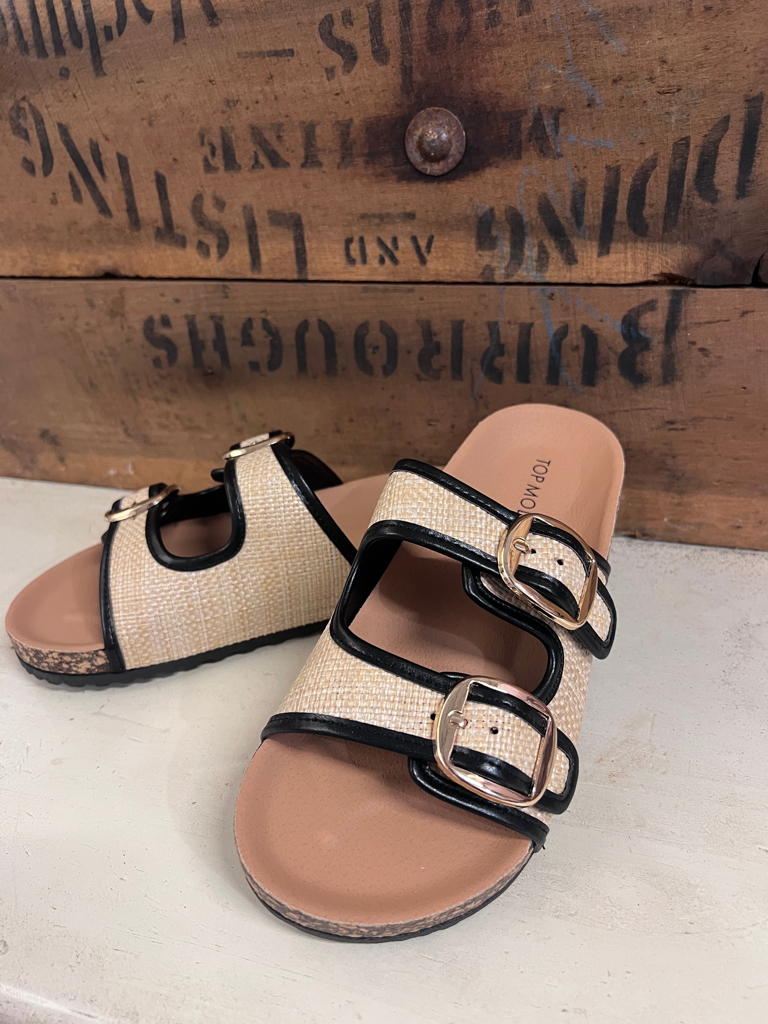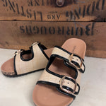 Double Buckle Raffia Sandals | Tan and Black