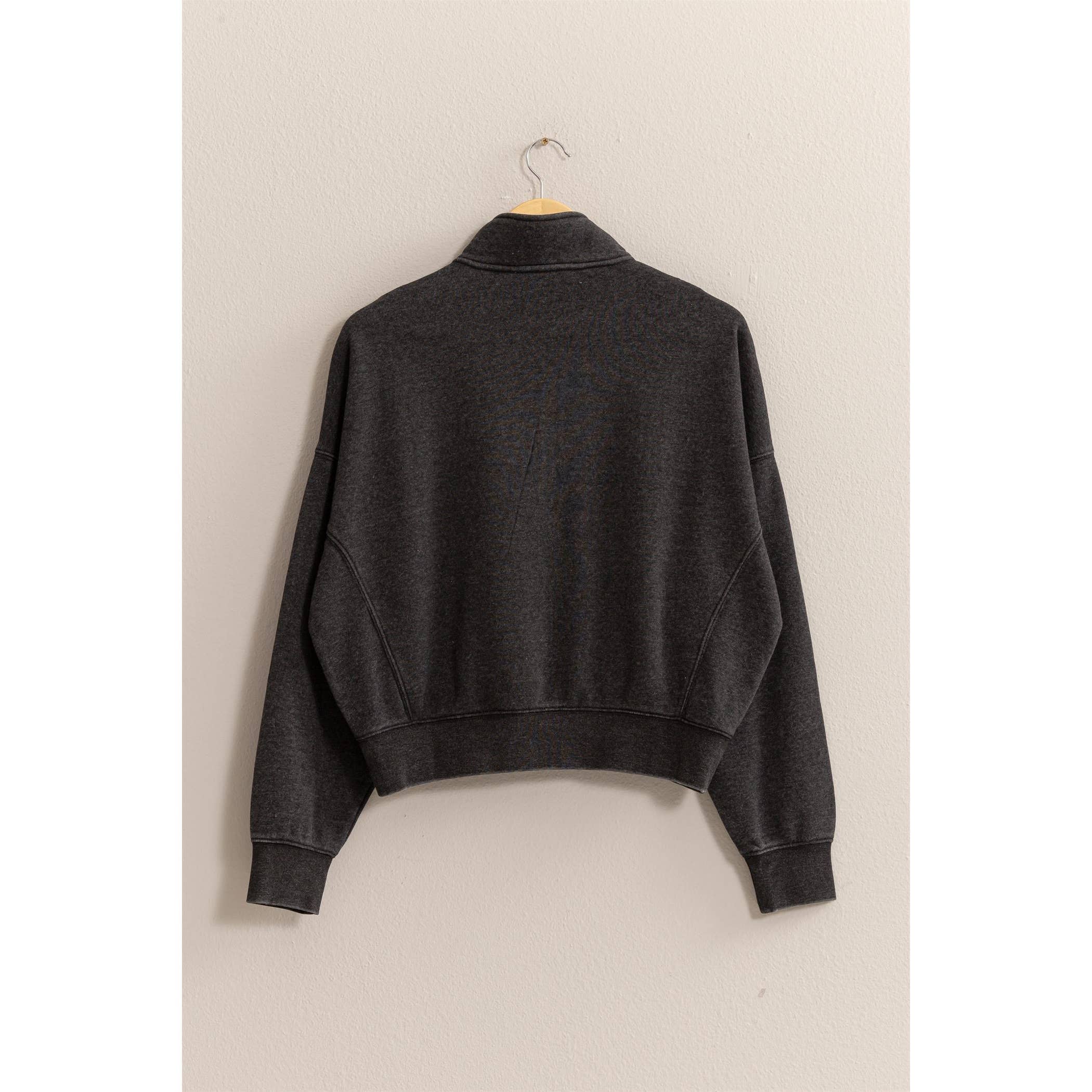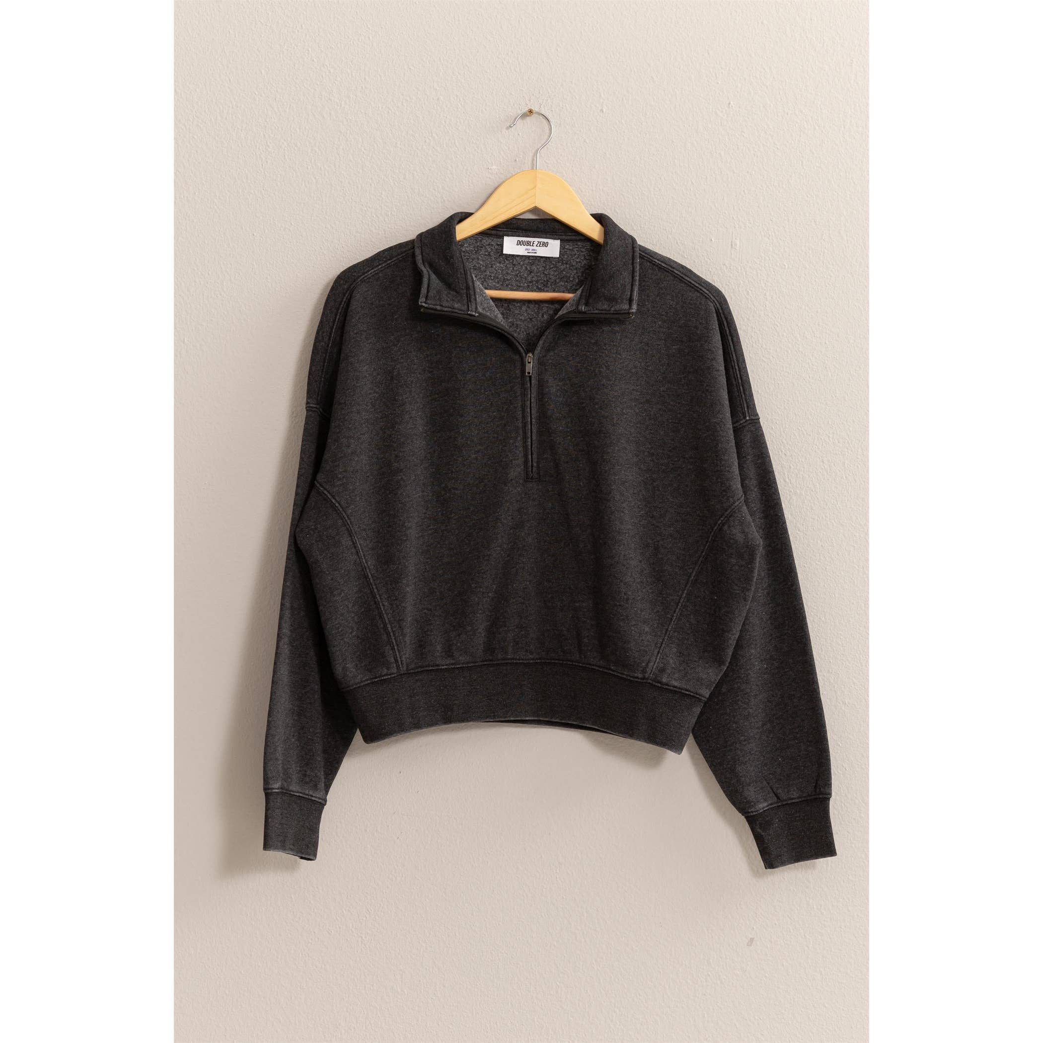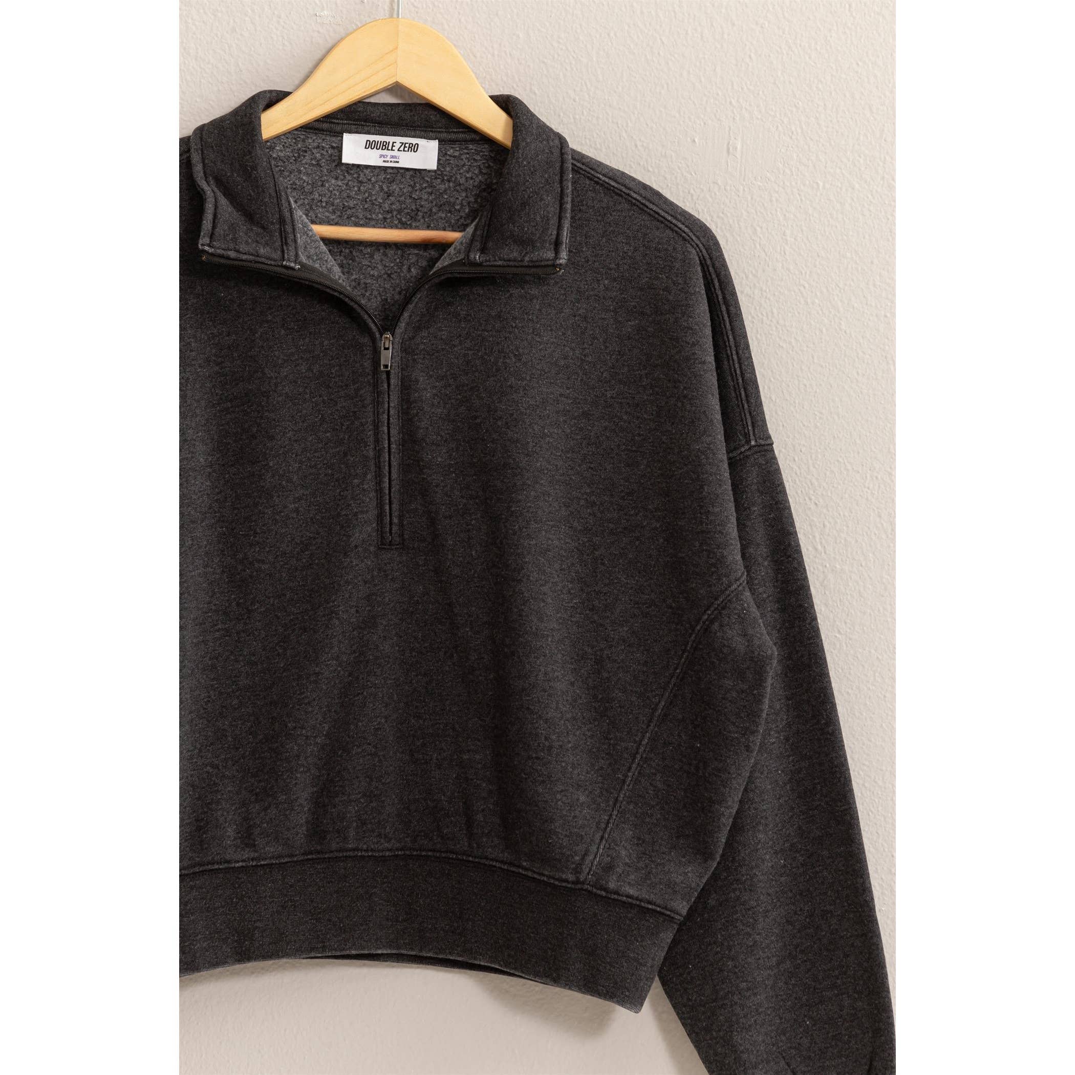 THIS SWEATSHIRT IS DESIGNED WITH A CASUAL-CHIC AESTHETIC, CHARACTERIZED BY A COLLAR, EASY HALF ZIPPER CLOSURE AND LONG SLEEVES WITH DROP SHOULDERS. THE RELAXED FIT WITH CINCHED CUFFS AND HEM KEEPS YOU FEELING COMFY. 51% COTTON 49% POLYESTER MODEL IS 5' 7" TALL, 32" CHEST, 25" WAIST AND 36" HIPS AND WEARING A SIZE SMALL IMPORTED. DESIGNED IN THE USA