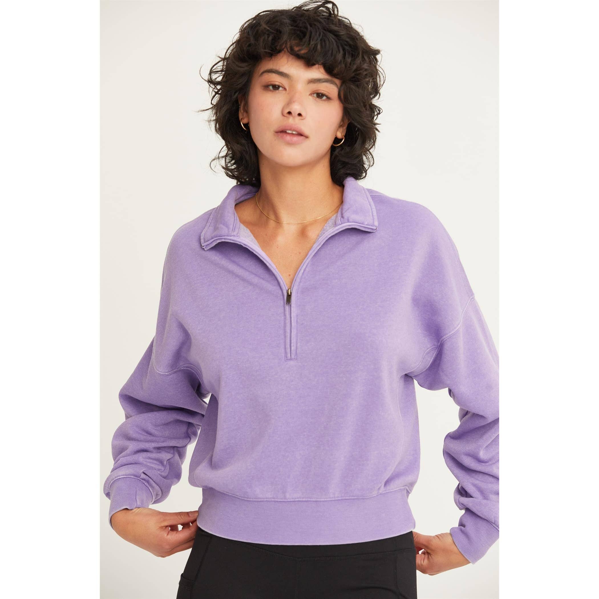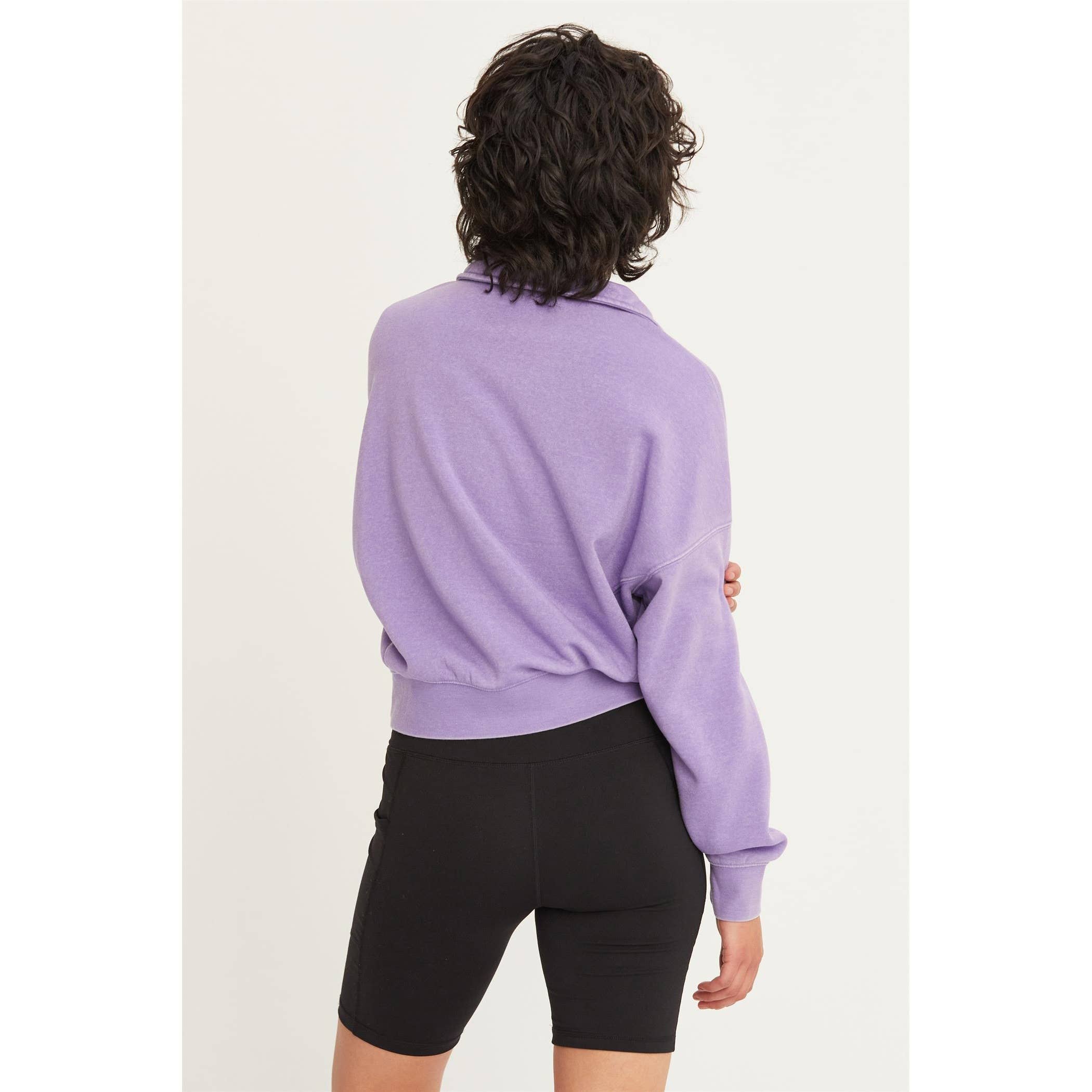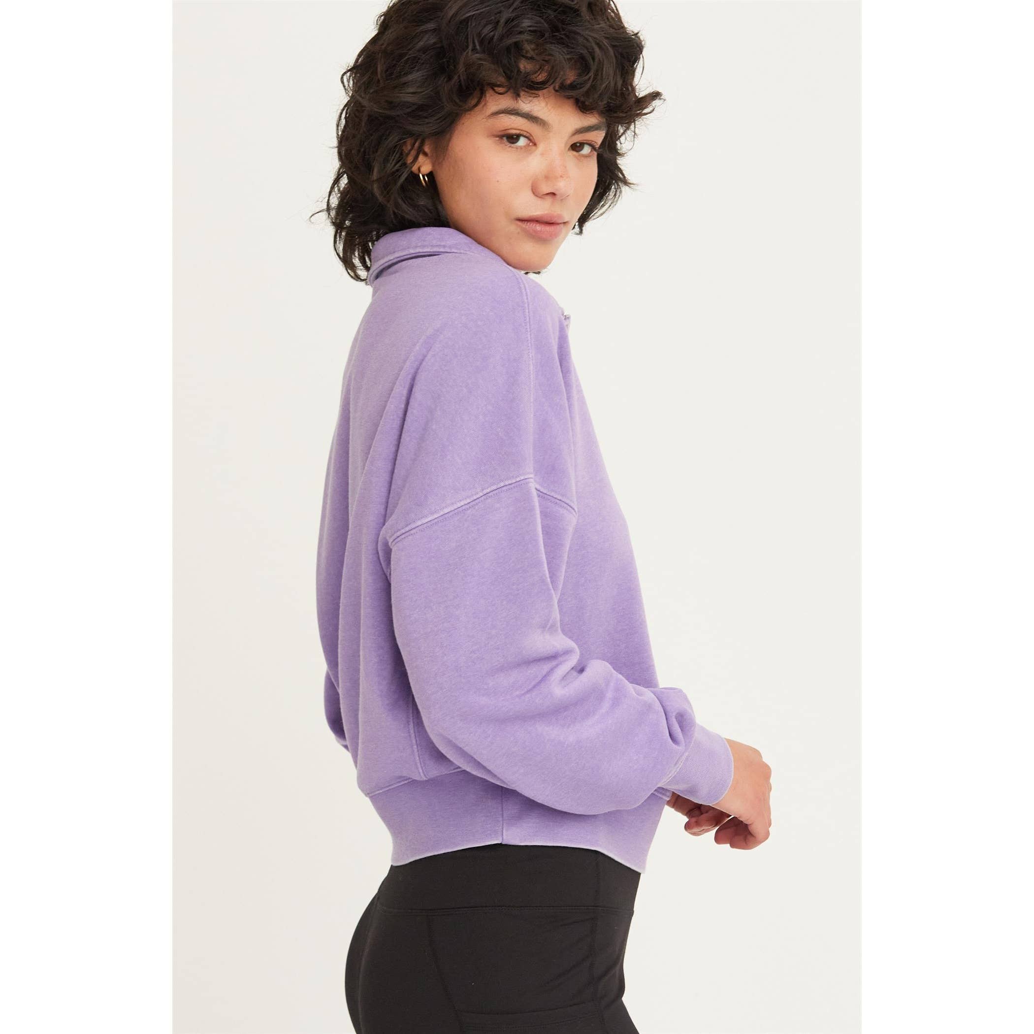 THIS SWEATSHIRT IS DESIGNED WITH A CASUAL-CHIC AESTHETIC, CHARACTERIZED BY A COLLAR, EASY HALF ZIPPER CLOSURE AND LONG SLEEVES WITH DROP SHOULDERS. THE RELAXED FIT WITH CINCHED CUFFS AND HEM KEEPS YOU FEELING COMFY. 51% COTTON 49% POLYESTER MODEL IS 5' 7" TALL, 32" CHEST, 25" WAIST AND 36" HIPS AND WEARING A SIZE SMALL IMPORTED. DESIGNED IN THE USA