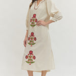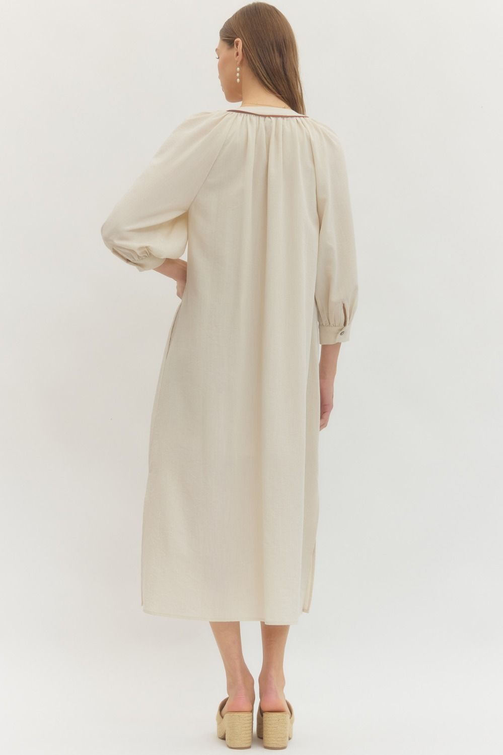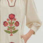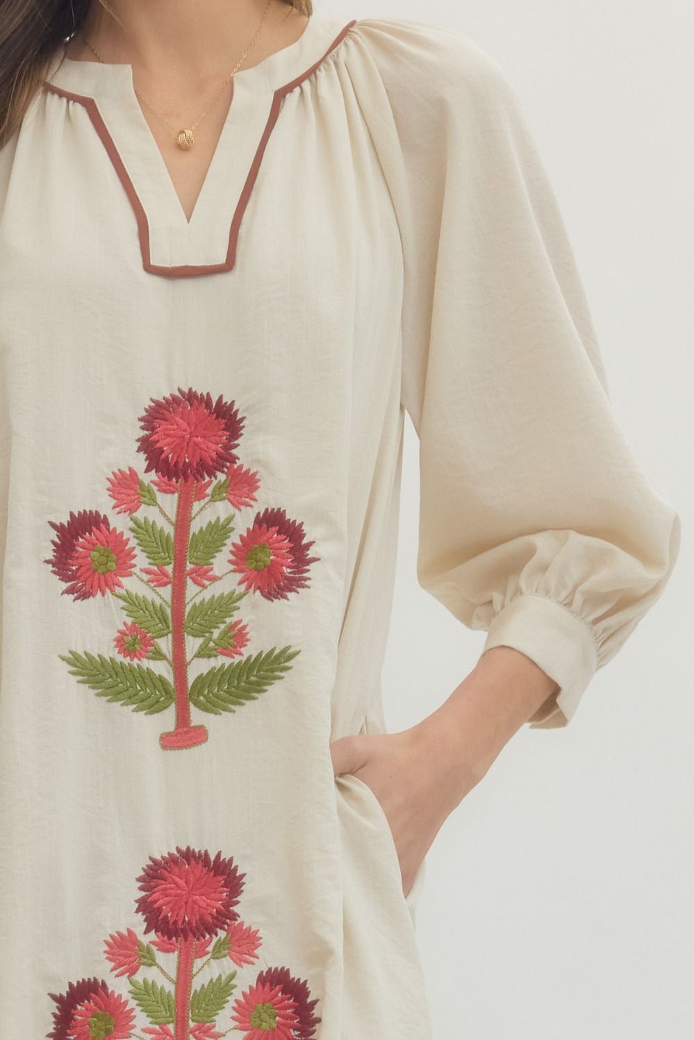 Twirl into elegance with this embroidered floral long sleeve maxi dress that's equal parts romantic and ready-to-go. The contrast trim V-neck adds a touch of sophistication, while strategically placed side slits keep things breezy and fun. Buttoned cuffs let you adjust the fit to your vibe, and a hidden side pocket means you've got room for the essentials. Fully lined for comfort and confidence, this woven beauty skips the sheer factor entirely—what you see is what you get. Lightweight enough for all-day wear, whether you're heading to brunch, a garden party, or anywhere that calls for a little extra flair.
