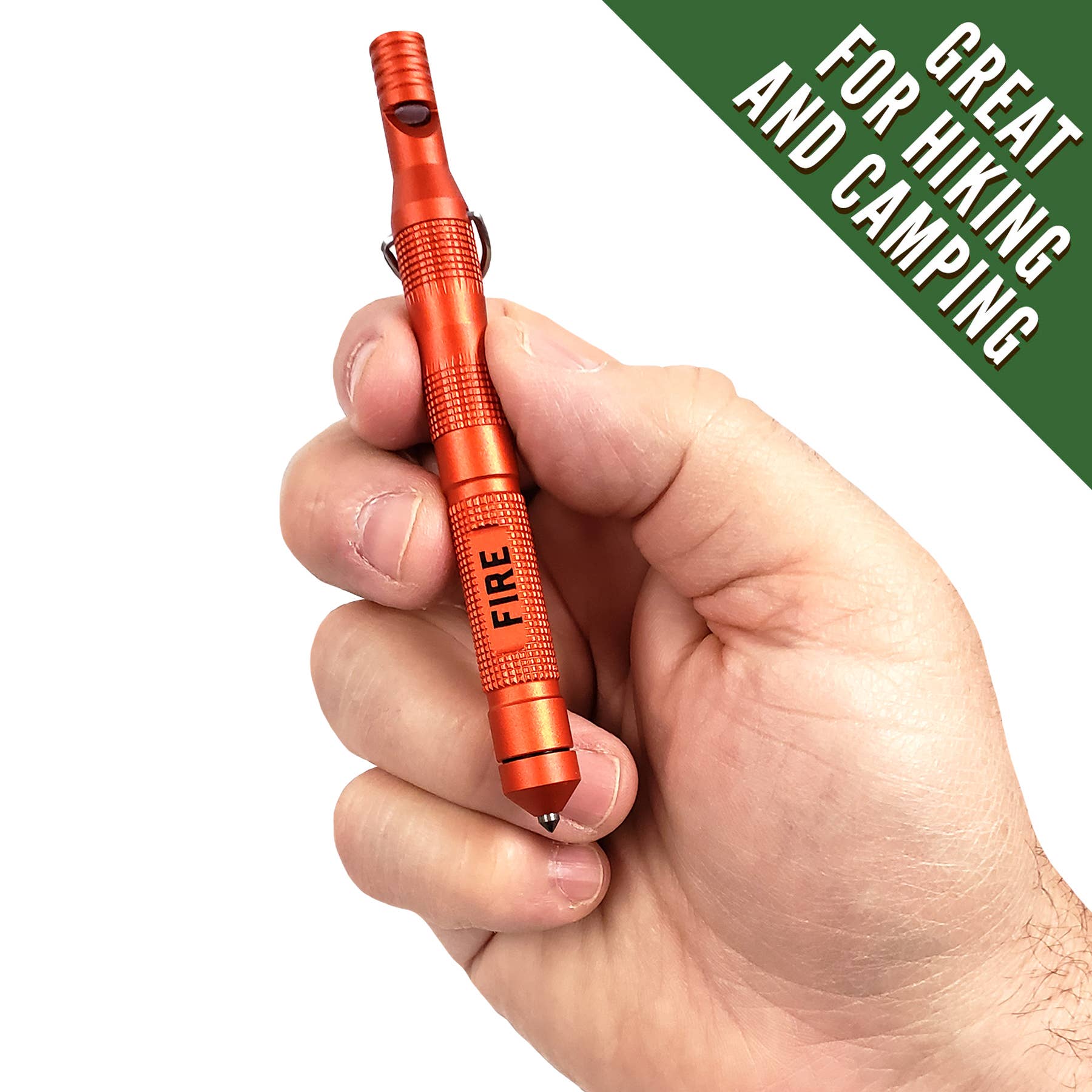 This best-seller is sure to fly off your shelves. It's a hit year after year because it works in any weather condition - rain, snow, or high altitude. Great for camping, hiking, and survival. Includes a tungsten steel glass breaking tip (for car emergencies), and a whistle. Cotton batting included inside the body for use as fire kindling. Size: 4.25" length Body: Aluminum (lightweight!)
