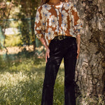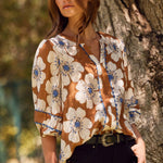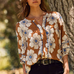 Floral printed 3/4 sleeve blouse featuring lace detail, a relaxed fit, and a split neckline.