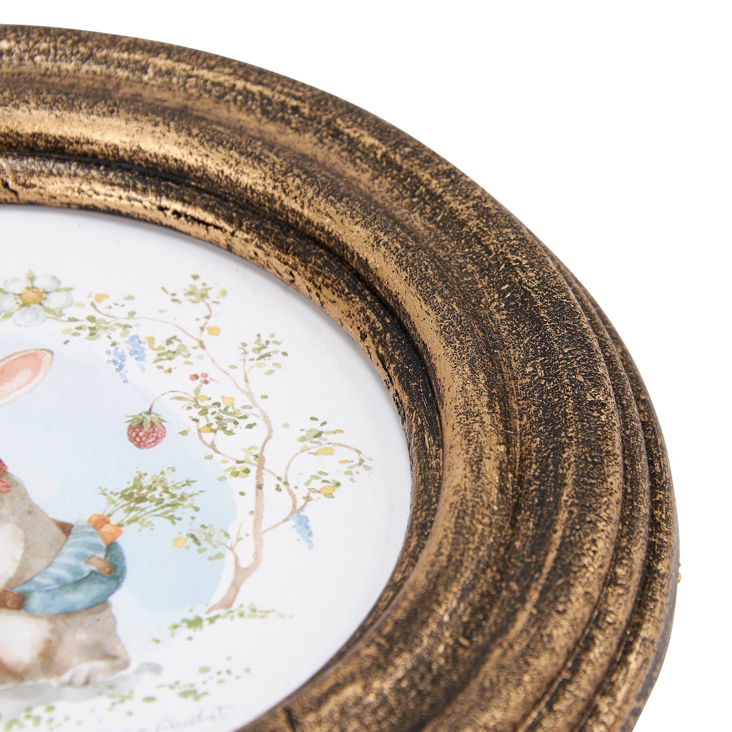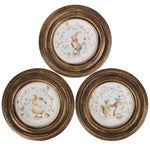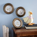 Small framed art pieces from our Baby & Kids Collection displaying three charming scenes of garden animals inspired by children's storybook illustrations. Garden animal designs are replicated from original art hand painted in a delicate watercolor style. Each hanging décor piece features natural wood frames with coordinating antique bronze finish and distressed details. Our Garden Friends hanging décor is easy to hang for display via attached sawtooth hangers or free-stand on flat surface using back easels. A cute garden-themed home accents perfect for children's room decor.