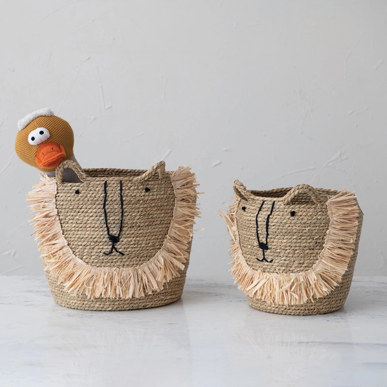 Hand-Woven Seagrass Lion Baskets w/ Handles, Natural