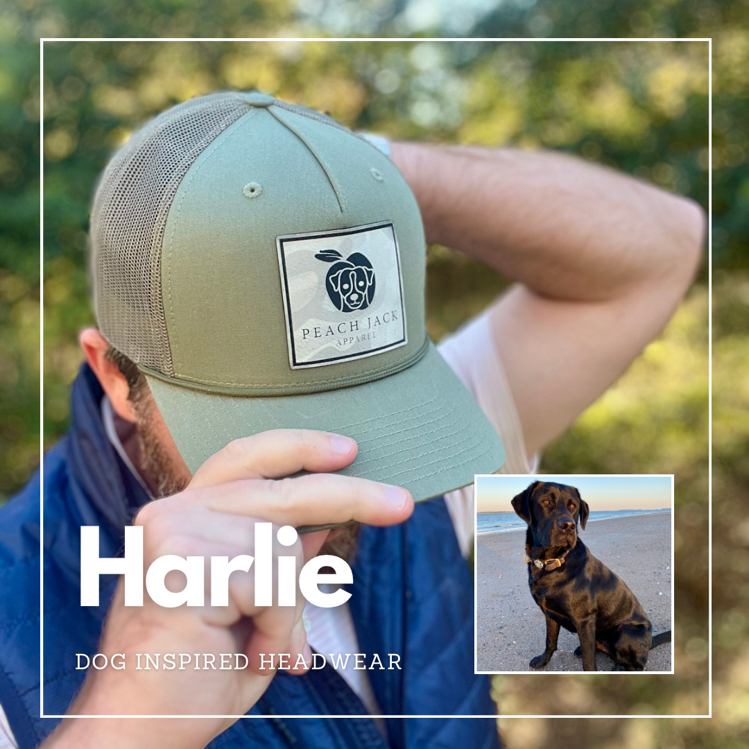 Loden Five Panel Trucker Rope Hat with camo leather patch.