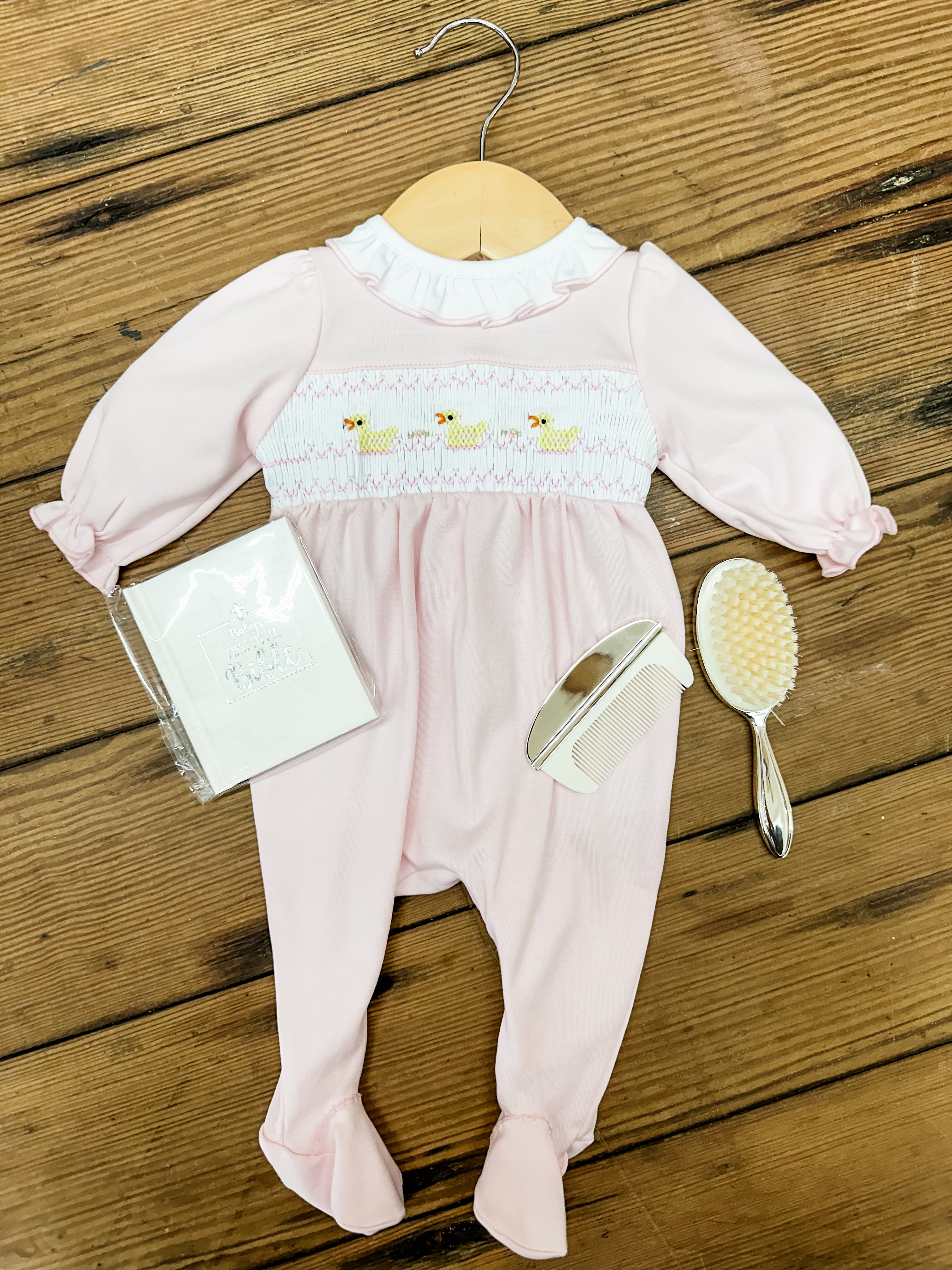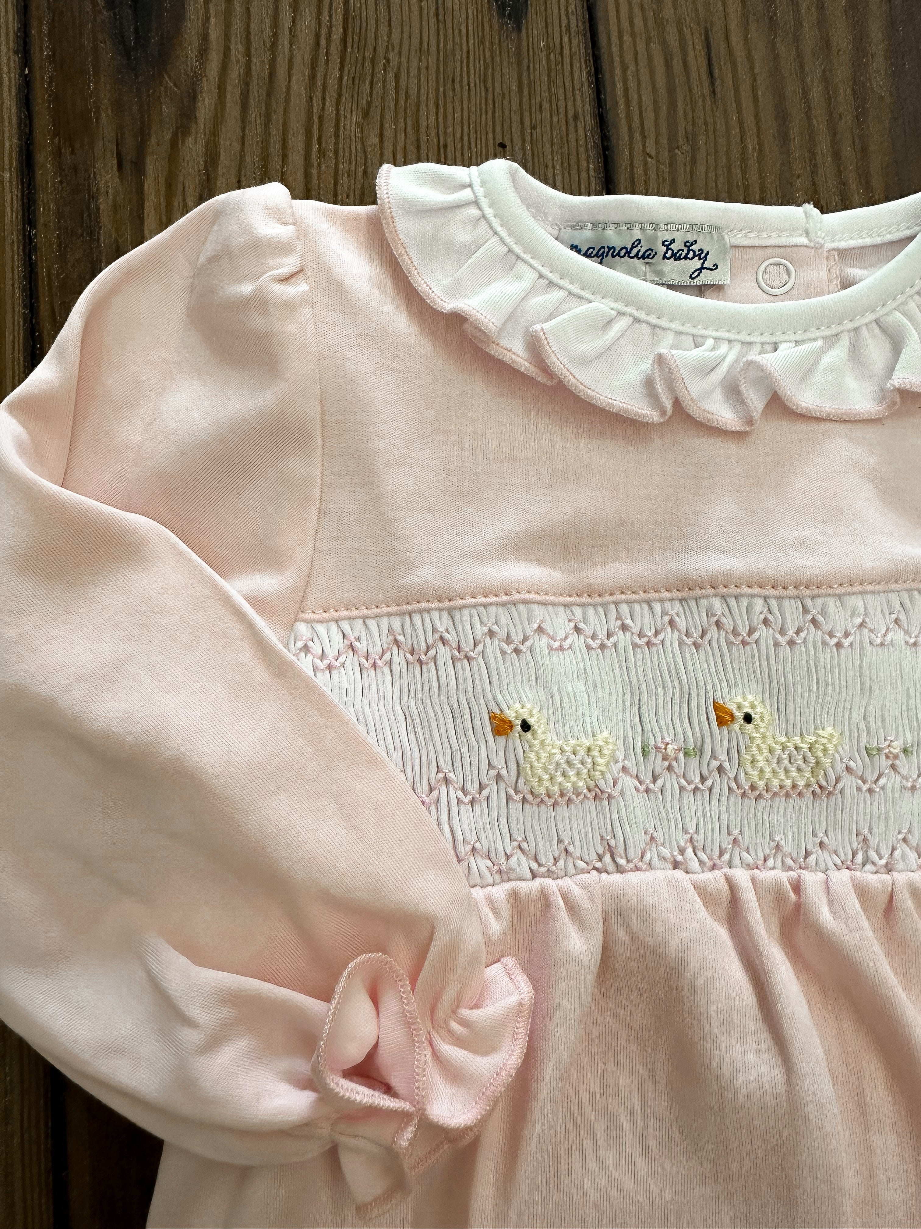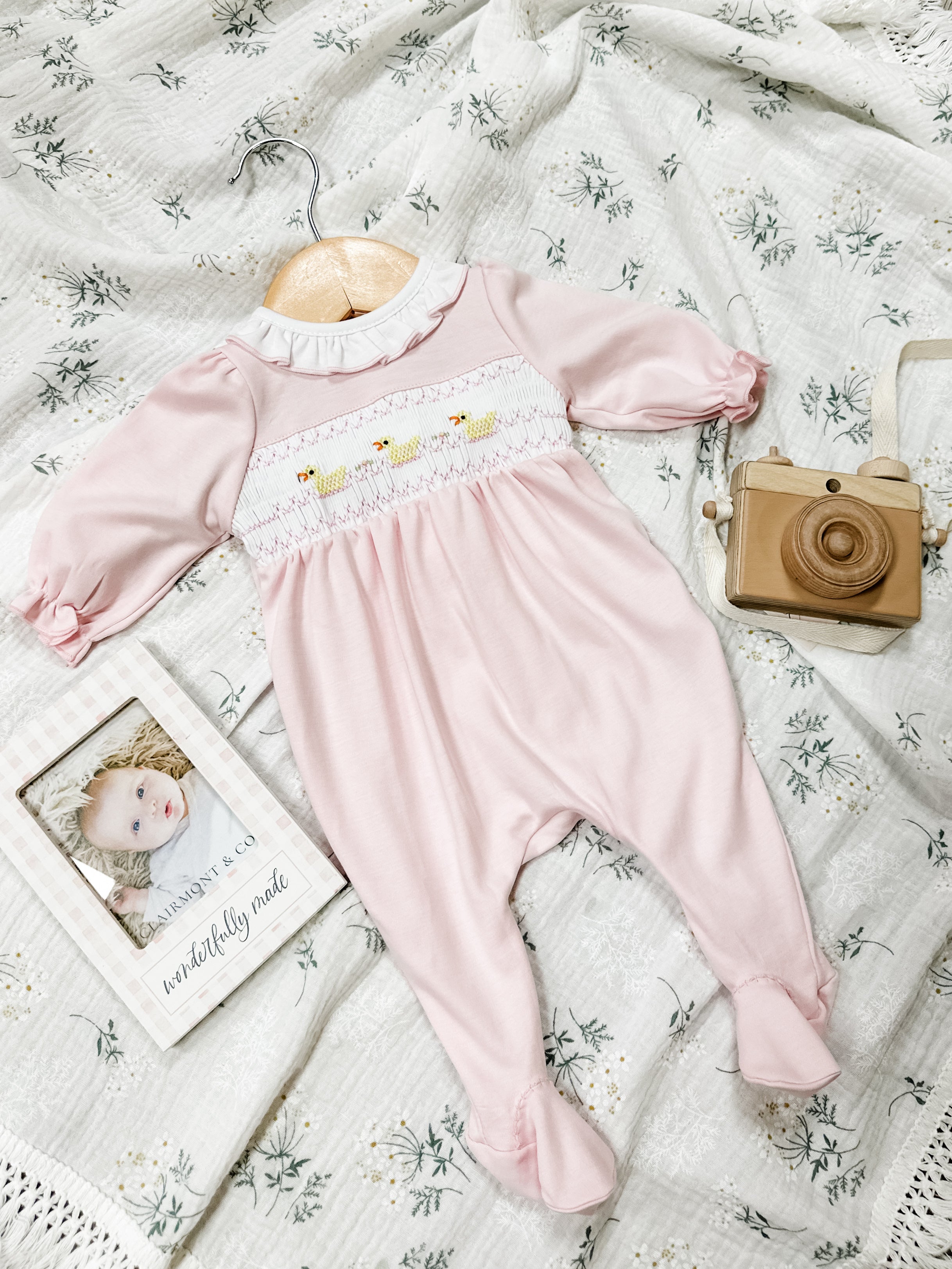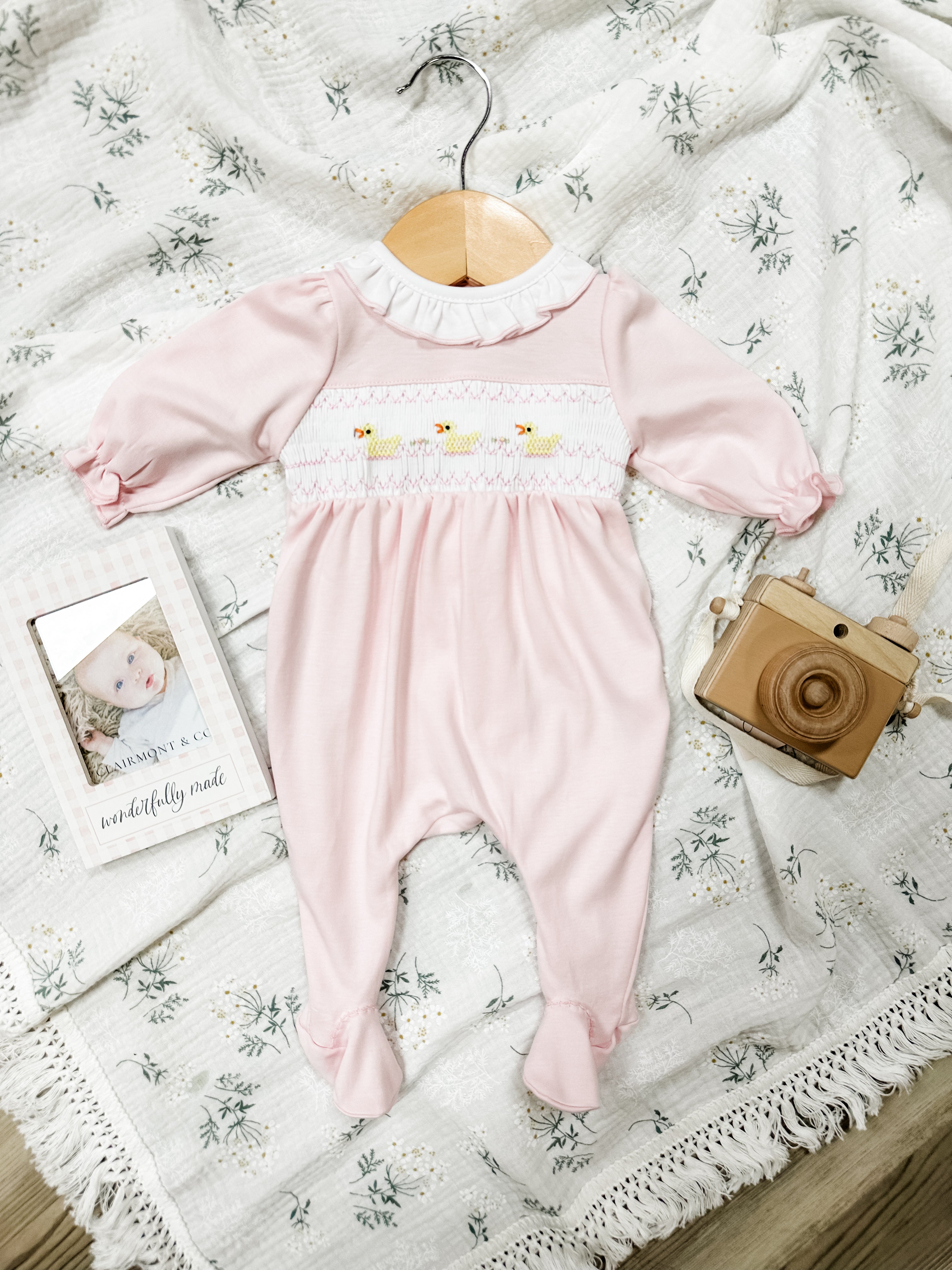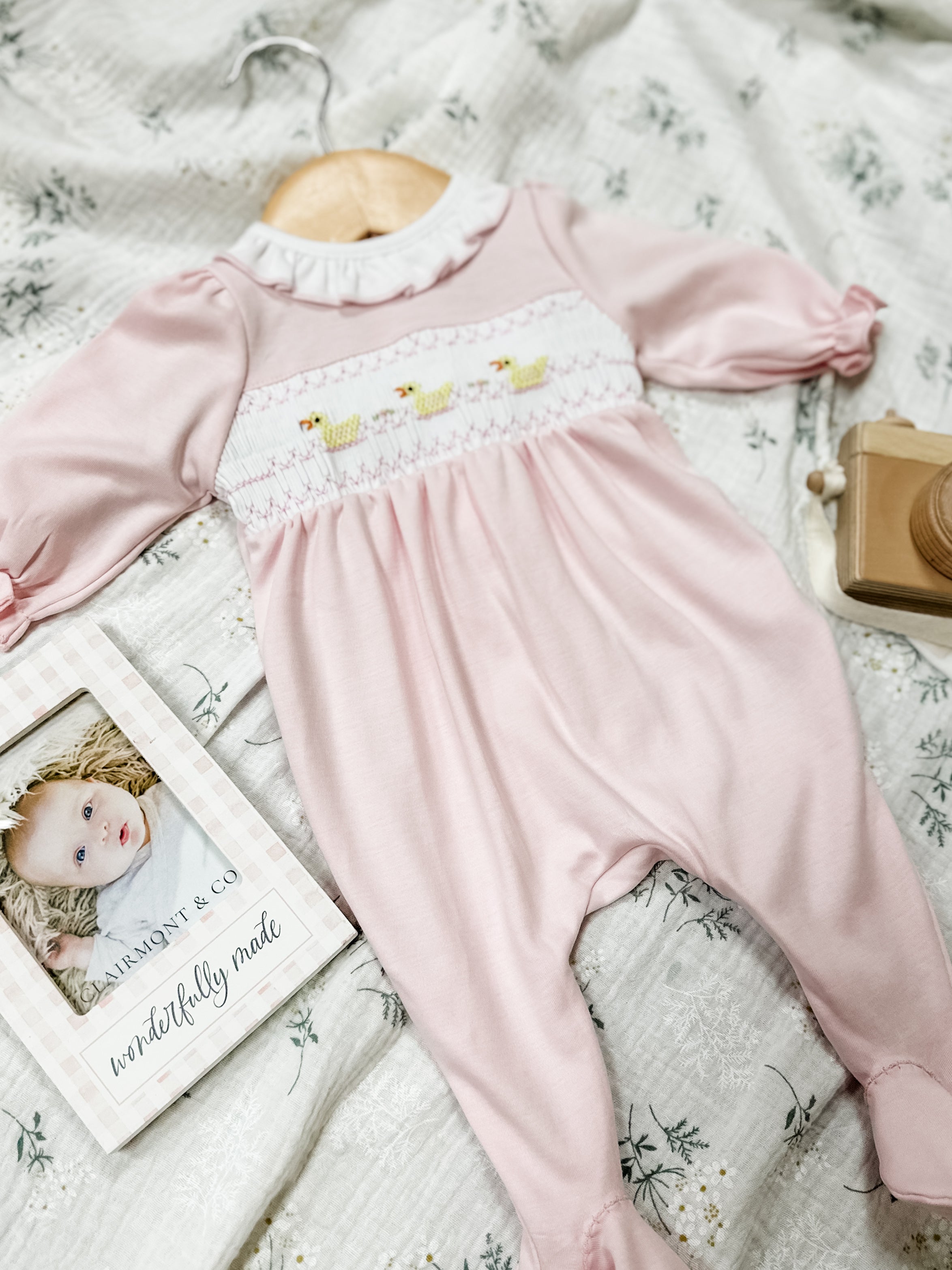 Expertly crafted and designed for ultimate comfort, our Just Ducky Classics Smocked Footie in Pink is the perfect choice for your little one. Made with soft, high-quality fabric and adorned with delicate smocking, our footie provides both style and functionality. Keep your baby cozy and stylish with Just Ducky.