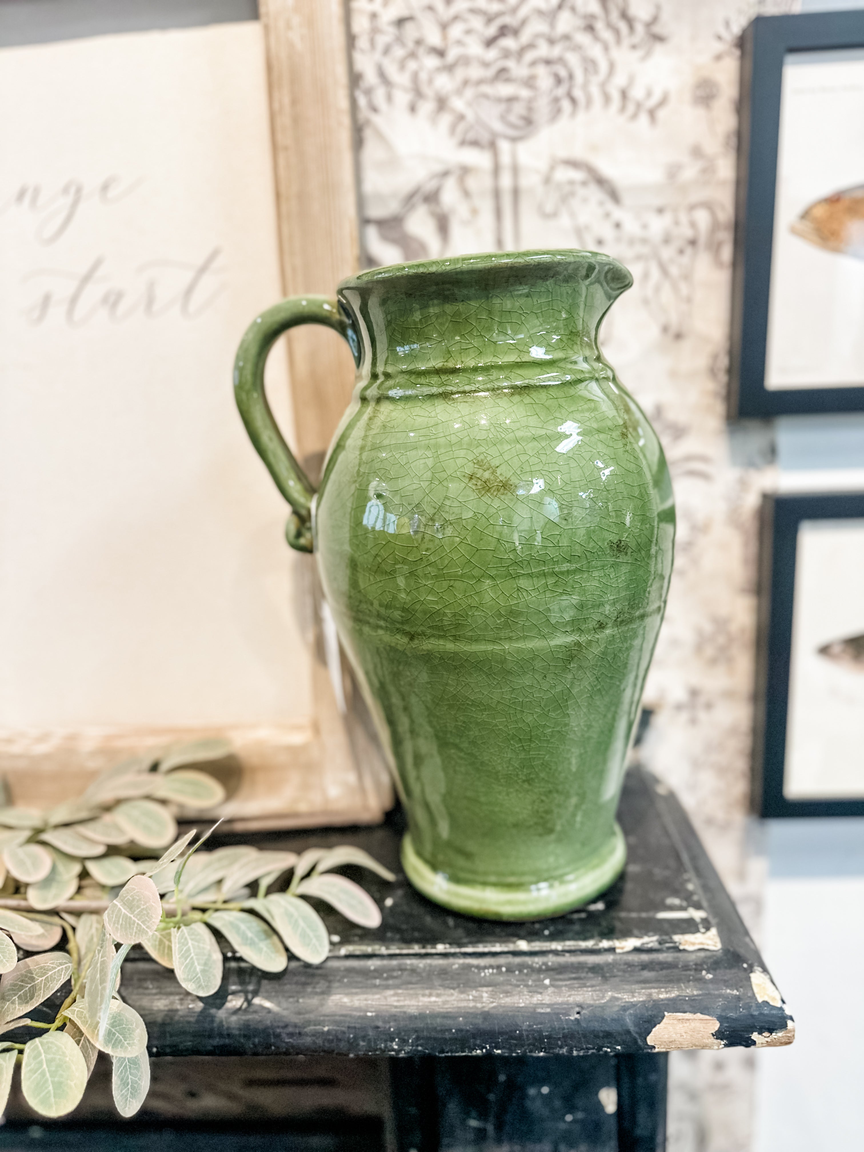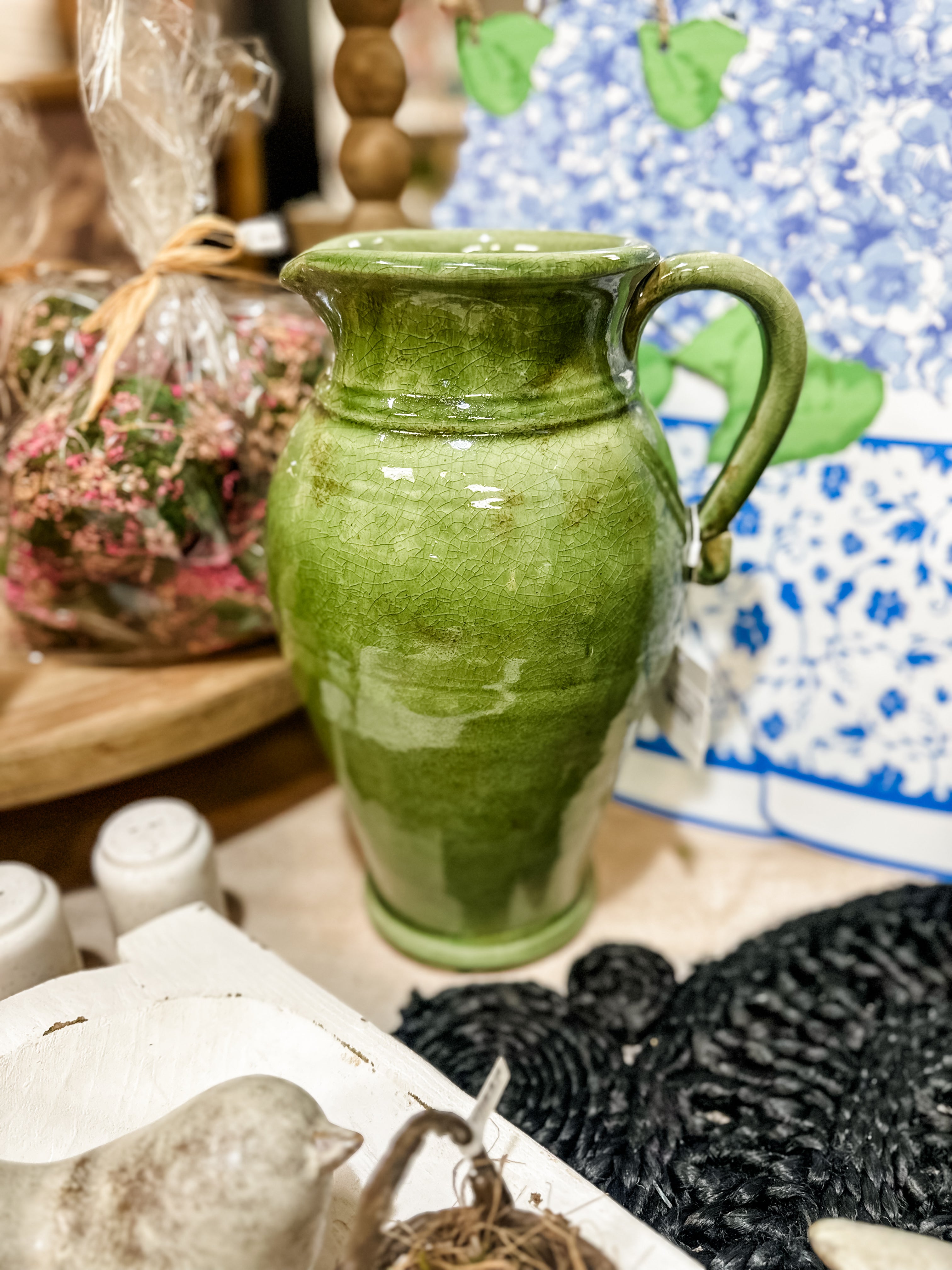 Meet your new favorite pitcher—a delightful green ceramic beauty that's ready to serve up refreshment with personality. With its comfortable handle and cheerful hue, this charming vessel transforms ordinary drinks into special moments. Whether you're pouring fresh juice at brunch or displaying wildflowers on your shelf, this playful pitcher brings joy to every use!