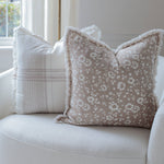 Our Fleur & Fray pillow collection brings timeless elegance and cozy charm to any space. With soft whites, creams, taupes, and beige tones, these pillows feature delicate patterns of plaid, floral, and stripes, paired with textured details and frayed edges. Perfect for layering on beds, couches, or chairs, these pillow covers add sophistication to any decor. Crafted from high-quality materials, this collection is both durable and stylish. DETAILS • Features an invisible zipper closure to easily slip over any pillow • Fits a 22" x 22" Pillow Insert {20" Pillow Cover} FABRIC OPTIONS • White with Brown Plaid - 100% Slubbed Cotton CARE • Spot cleaning or hand washing {inside out} is recommended to keep your pillow looking its best. Lay flat to dry. • Iron as needed. • Do not bleach.