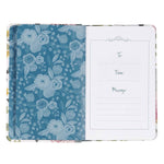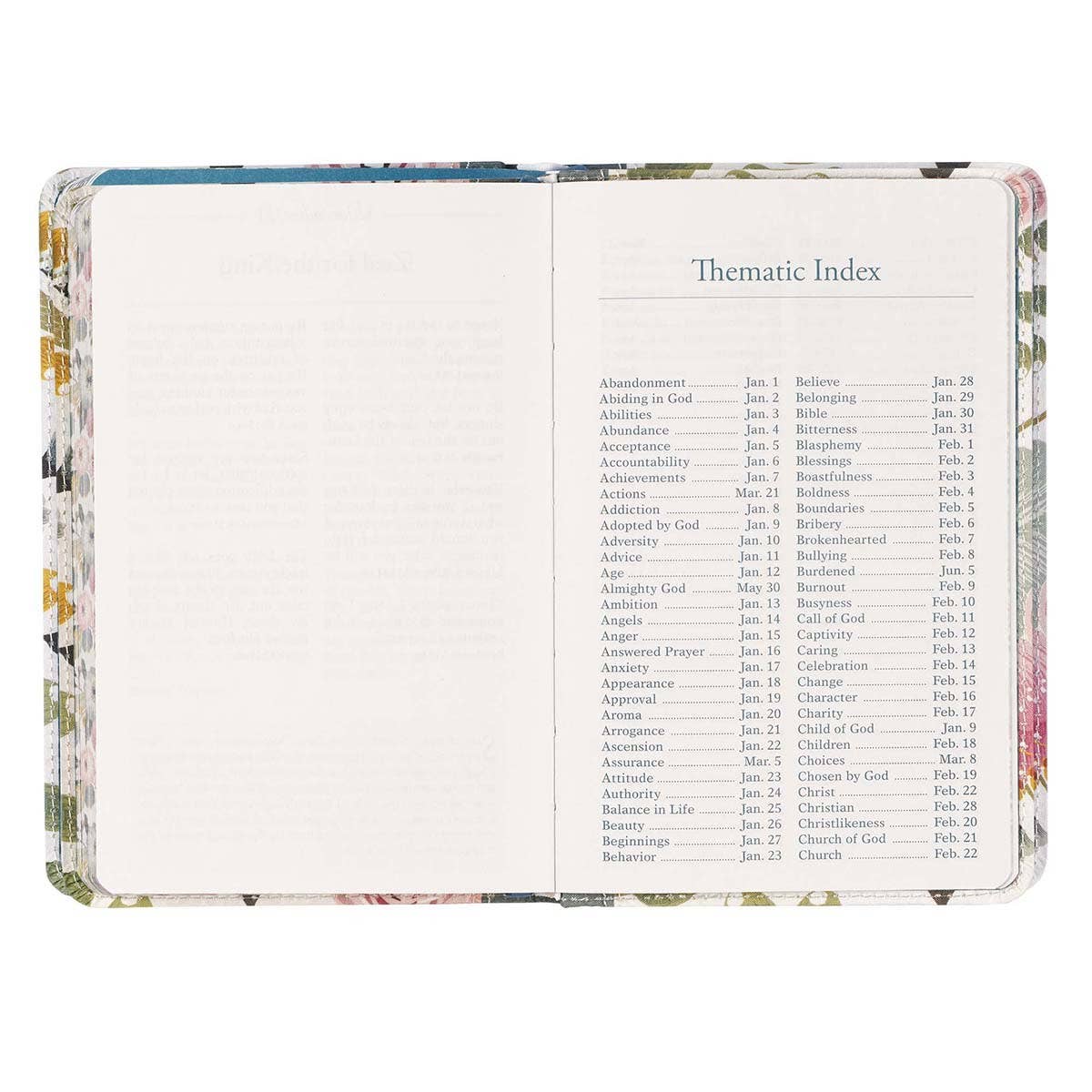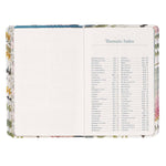This Bible-based Pocket Bible Devotional For Women was written to instill a love for God's powerful Word in every woman's heart. The floral printed flex cover has a gray spine and appliquéd title patch and is styled in a traditional half-bound design with a modern floral twist that features oversized flowers in pink and gray-green tones. The floral design is carried over to the page edges that feature a printed floral design. The title is printed in white and pink lettering on a gray appliquéd patch attached with white top stitching. The Pocket Bible Devotional for Women A blue ribbon marker that matches the blue end pages is added for your convenience. Each of the 366 daily readings offers a collection of key Scripture verses on relevant topics: finding comfort, an eternity in heaven, a godly character, working hard, managing God