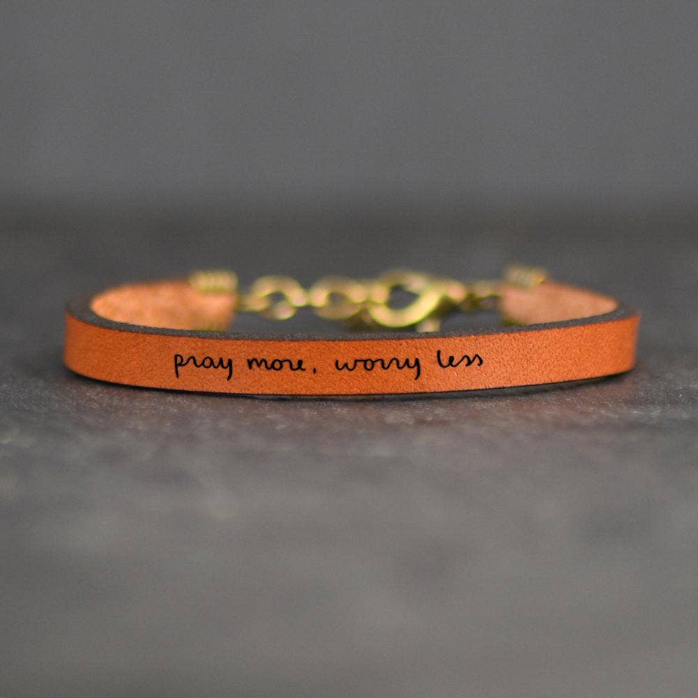 This bracelet reads "pray more, worry less" in laurel's original lower case script lettering. Leather is approximately 2mm thick // Bracelet is 1/4-inch wide -- the writing very small and delicate // See sizing selections for length details (all include extender chain) // Metal details made from brass // All handmade and sourced in the US