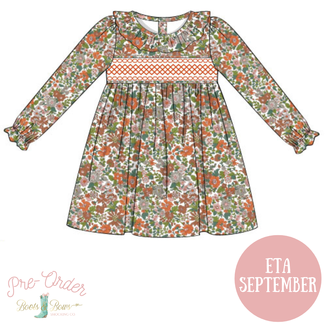 The prettiest fall floral dress! Classic style with a hand-smocked plate across the chest. We hope this is the perfect addition to your family's fall traditions! * 65% Cotton/30% Polyester/5% Spandex * Fit true to size **Due to the handmade nature of these items, sizing may vary up to 1/2"**