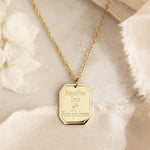 "Let not steadfast love and faithfulness forsake you; bind them around your neck; write them on the tablet of your heart." Proverbs 3:3 • This listing is for one (1) necklace that is engraved front and back • Lengths: 17" + 2" extender. Lengthens up to 19" • Measurements: 16mm x 12mm charm • Chain: Delicate simple chain • Finish: 18K gold over surgical or polished surgical steel. Tarnish resistant and waterproof. • Nickel Free and Lead Free. Hypoallergenic. • All our jewelry is packaged in signature LoveStory Collection by MAIVE gift box.