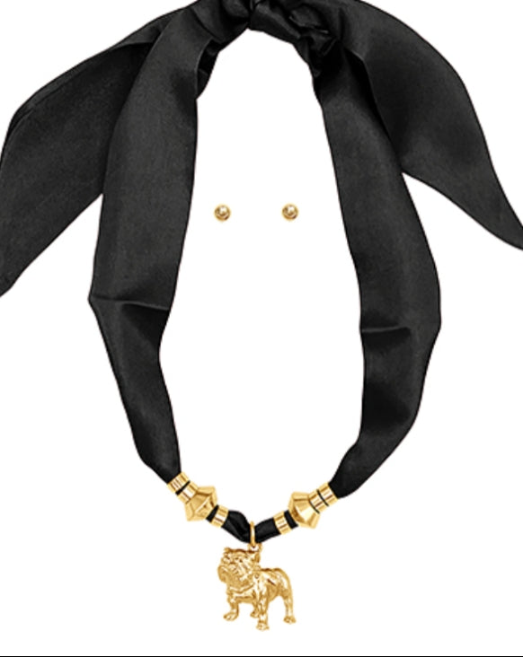 This charming necklace features a playful bulldog pendant crafted from metal, paired with a soft fabric scarf—perfect for showing your team spirit on game day!