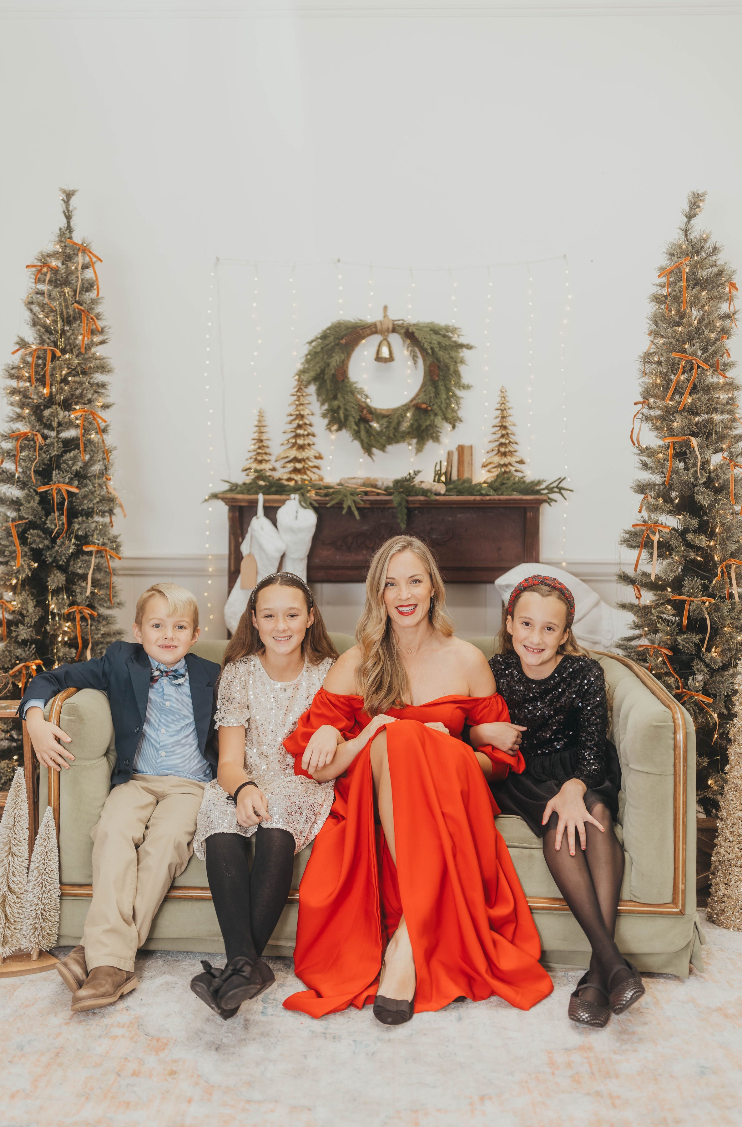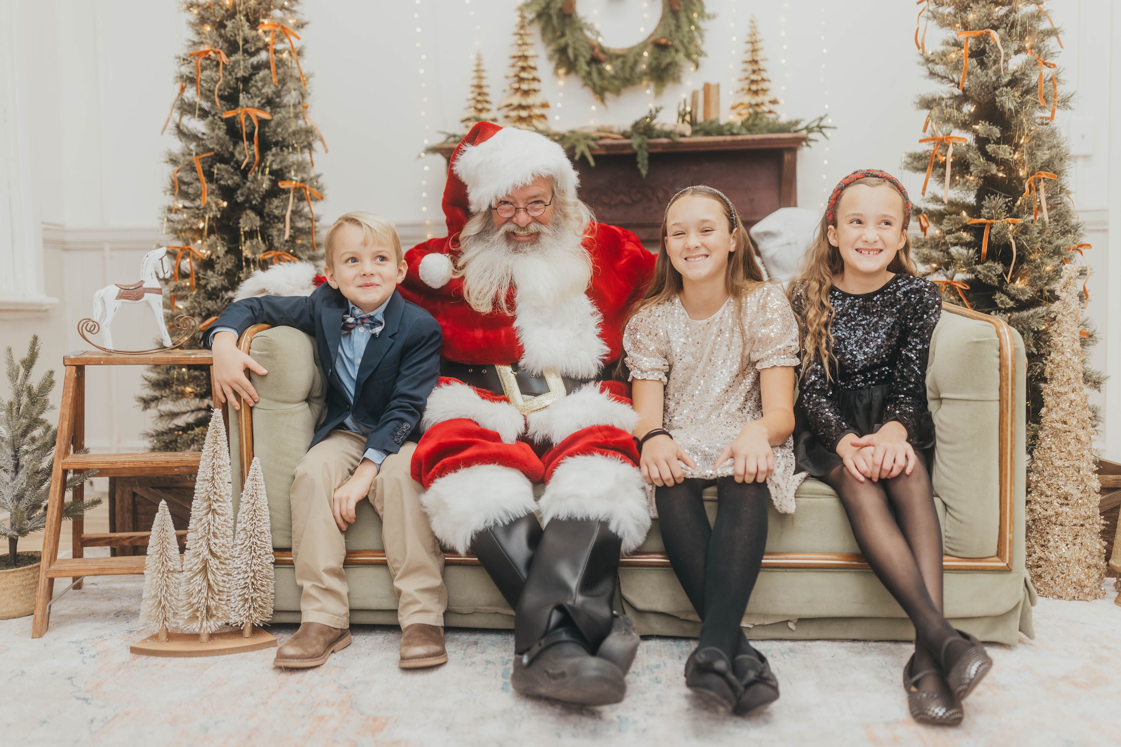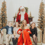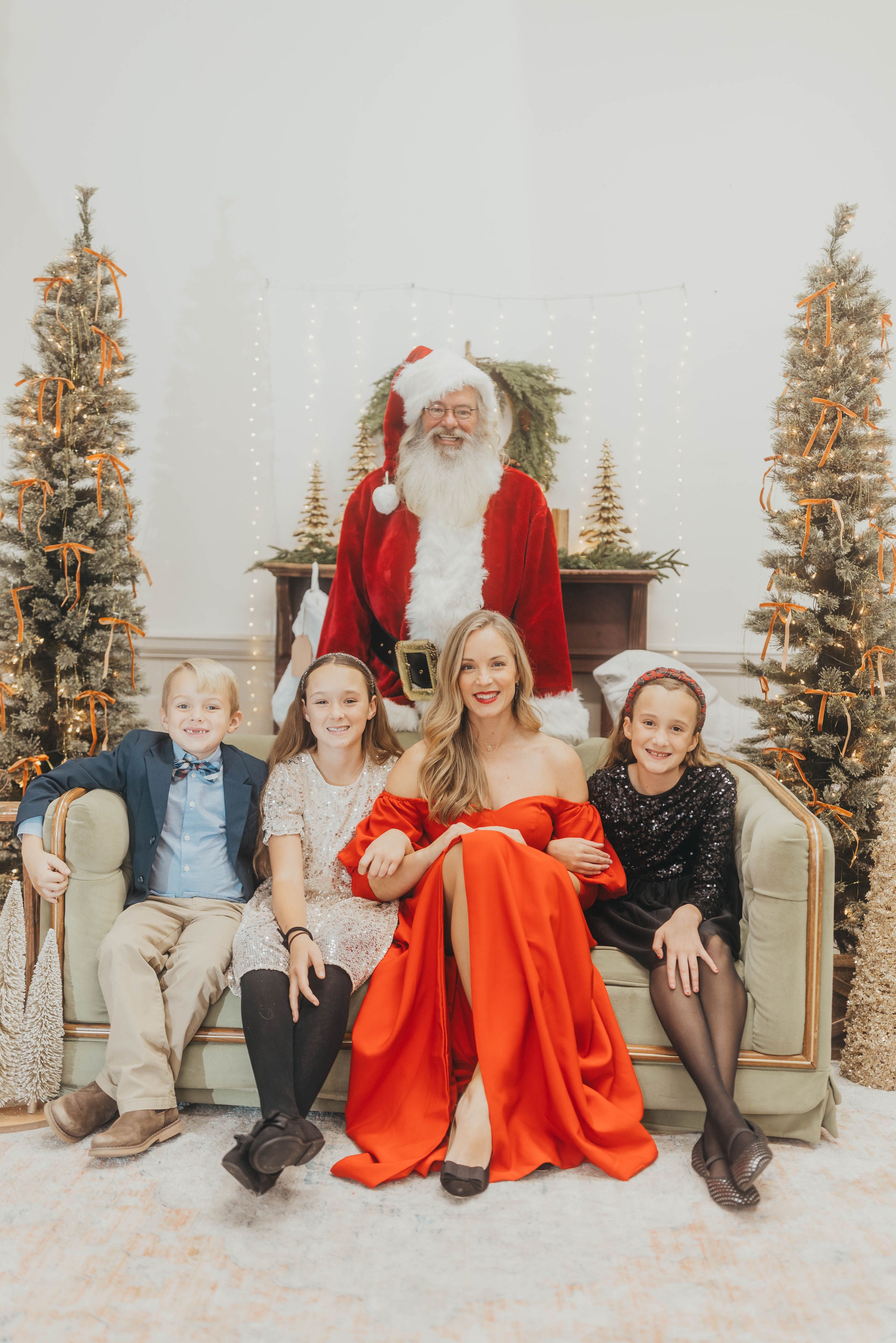 Santa will be sitting on a neutral couch or chair and the decor will be fairly neutral. A backdrop of white, green, green wreaths, and some gold accents. This should help you decide on your outfits!